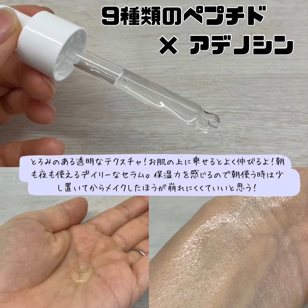 - 9種類のペプチド*とアデノシン*がお肌にハリとツヤを与えます。*整肌成分