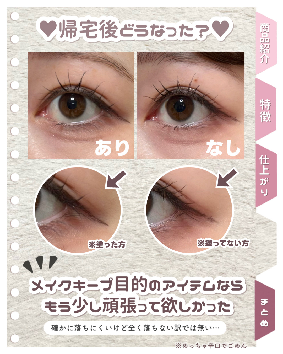 - にじみやすいメイクをしっかりキープ!新感覚のメイクトップコート ●メイクの上から瞬間密着&コート 3 層のコーティング膜※3 が密着し、メイクのにじみや落ちを防ぎます。 ●細かい部分まで塗りやすい極細ブラシ 目尻や眉尻など、細かい部分にもピンポイントで塗れる極細ブラシ。 ●目元をケアする 2 種の保湿成分 in アロエベラ葉エキス、バラエキス ※3 (アクリル酸ヒドロキシエチル/アクリロイルジメチルタウリン)コポリマーNa、イソステアリン酸ソルビタン、ポリソルベート60(皮膜形成剤)