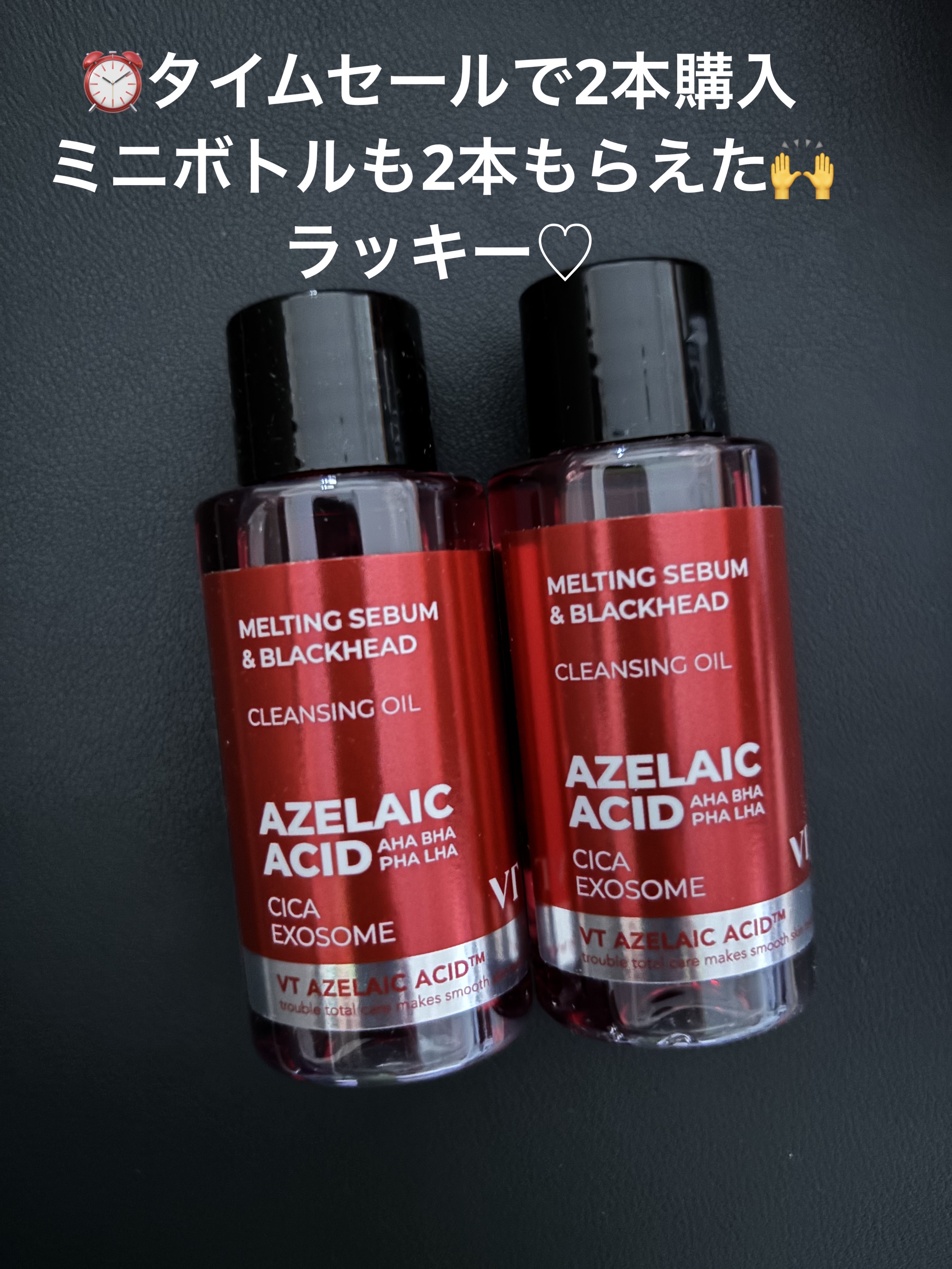 - 最近話題の毛穴ケア・整肌成分アゼライン酸!VTからはクレンジングオイルが登場! ポイントメイクまで落とすしっかりした洗浄力で、毛穴・皮脂までケアし保湿まで叶える一石三鳥アゼライン酸クレンジングオイル。 19種の植物性オイル*1も配合で、目に見えるブラッドヘッド*2から、隠れているホワイトヘッド*2、皮脂まですっきりケアします! ダブル洗顔不要! ※パッケージリニューアル ■このような方へおすすめ メイク・毛穴までディープクレンジング求める方 クレンジングでスキンケアまで行いたい方 ツッパリ感の少ないクレンジングを探していた方 ブラックヘッド*ケアも行いたい方 *1ダイズ油、アルガニアスピノサ核油、ユズ果実油、コメヌカ油、オタネニンジン種子油、アーモンド油、ザクロ種子油、リンゴ種子油、ホホバ種子油、ツバキ種子油、、バオバブ種子油、ユチャ種子油、ベニバナ種子油、ヒマワリ種子油、ヒポファエラムノイデス油、オリーブ果実油、アボカド油、アンズ核油、クロフサスグリ種子油(いずれも保湿) *2古い角質による