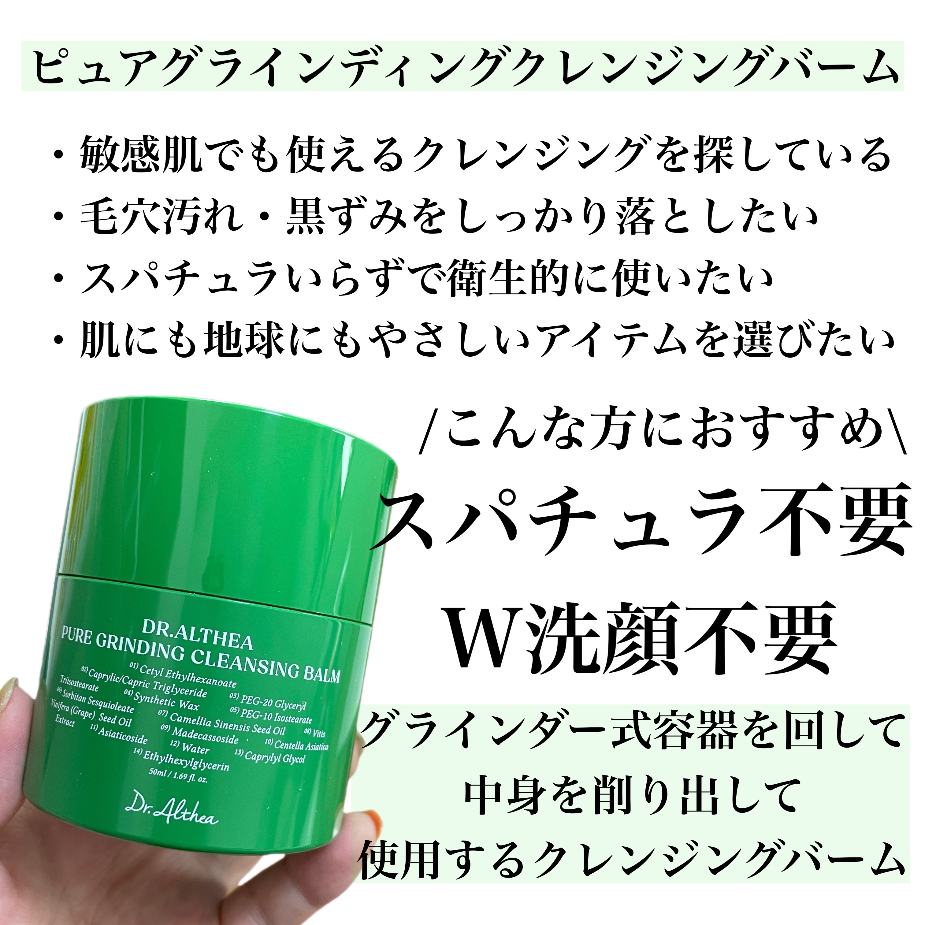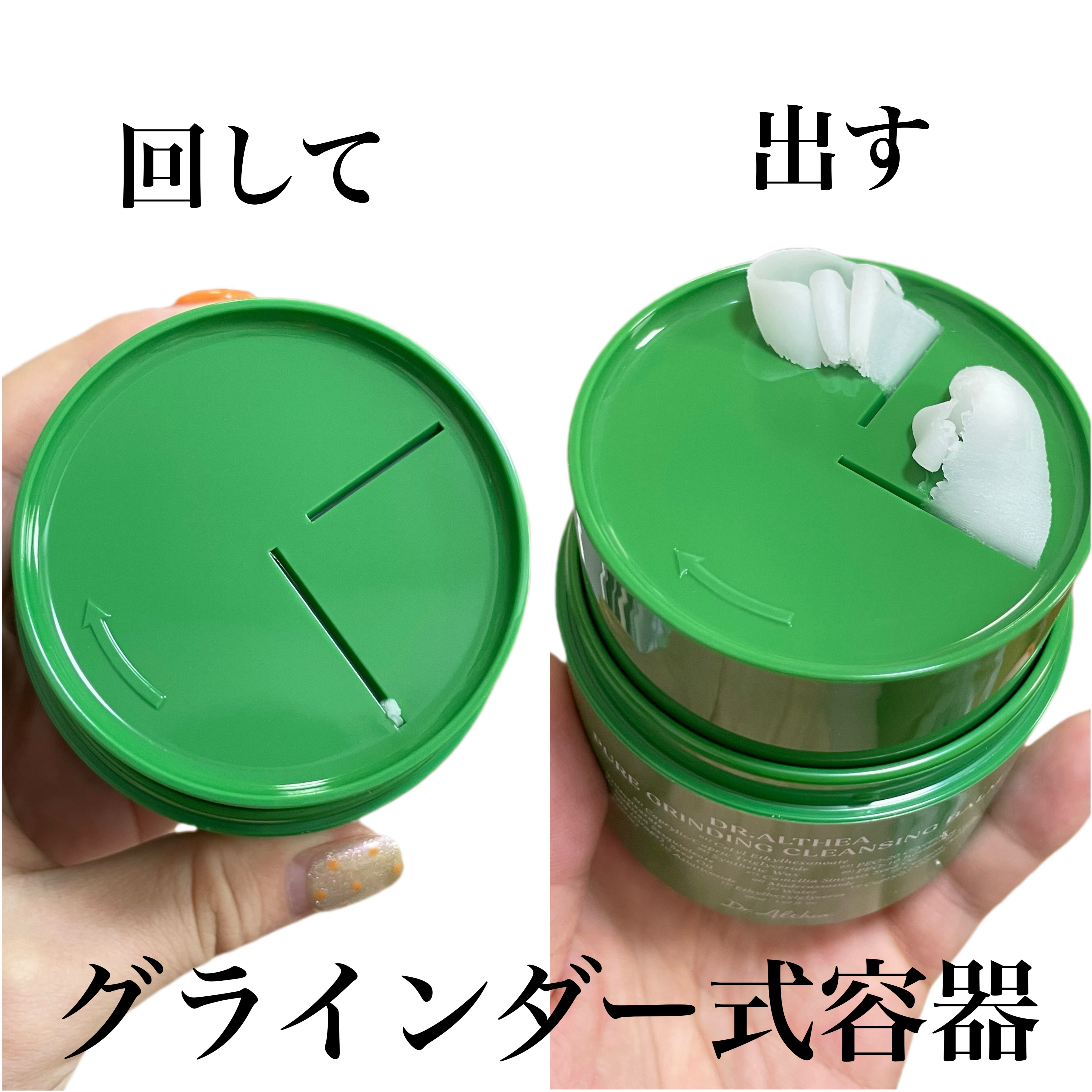 メガ割おすすめ敏感肌で肌に優しいスキンケアブランドDr.Althea(ドクターエルシア)@dr.althea_japan_official💚ピュアグラインディングクレンジングバームグラインダー式容器を回して中身を削り出して使用するクレンジング...