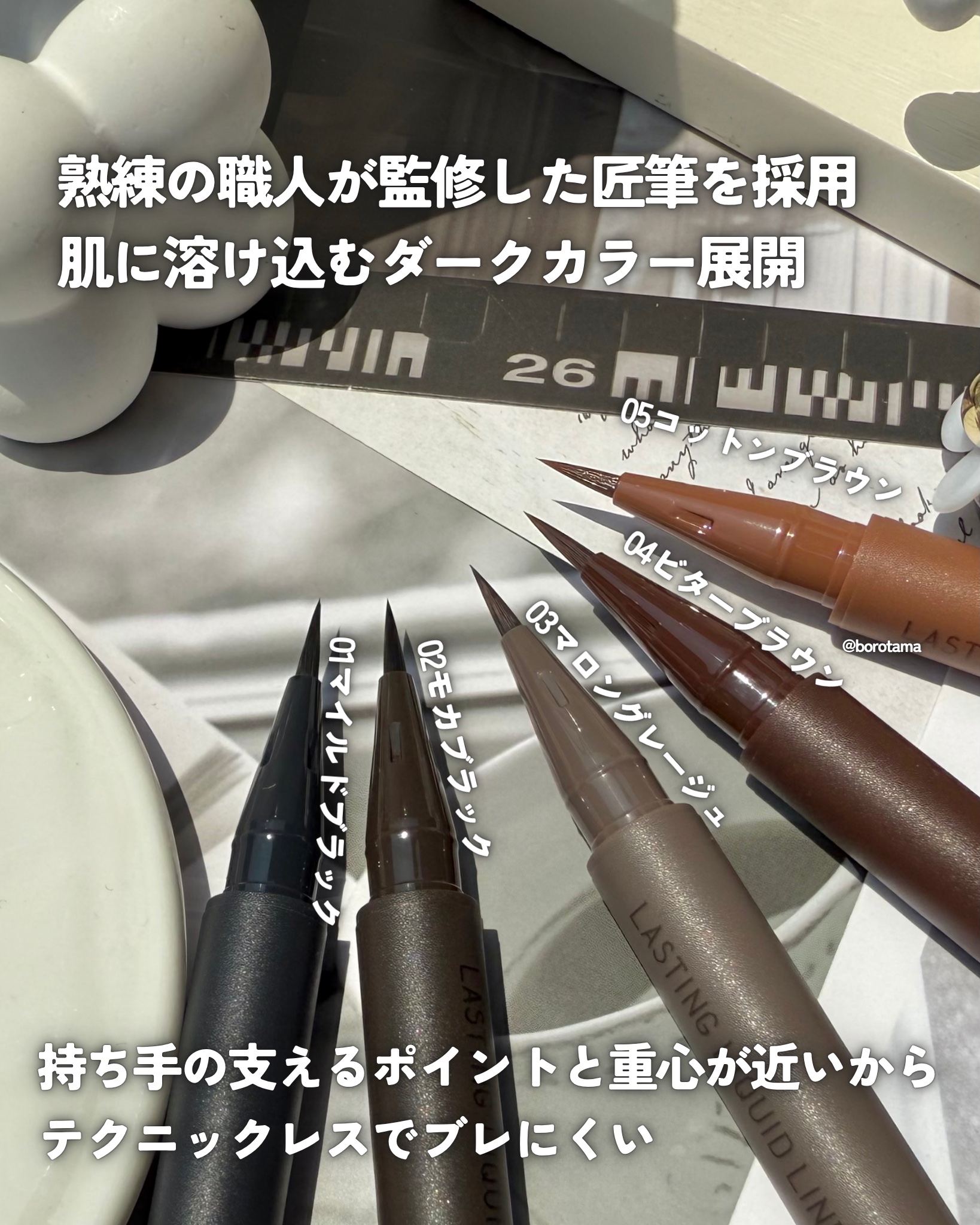 - リニューアル発売 落ちにくい。テクニックいらずで、ブレずに描けるリキッドライナー。 ナチュラルにフレーム際立つ絶妙カラー。 〇新設計※! ※エテュセ内 後方重心設計でブレを防ぎ、安定したなめらかな描き心地を実現。 ー容器の後ろ側に「金属ウェイト」を内蔵。 ー職人により混毛した匠筆×コシのある筆に最適ななめらか液 〇つけたての仕上がりが1日中※持続。 ※12時間持続試験実施済み (エテュセ スキンケアパウダー (プレスト)と併用時) 〇ウォータープルーフ・スマッジプルーフ (エテュセ スキンケアパウダー (プレスト)と併用時) 〇肌に溶け込み、浮かないカラー設計で自然な仕上がり ー肌なじみピグメント配合 〇汗・皮脂・涙・こすれに強い(エテュセ スキンケアパウダー (プレスト)と併用時) 〇お湯で簡単に落とせる 〇美容液成分配合 保水成分(ヒアルロン酸) 〇無香料 〇アレルギーテスト済み(すべての方にアレルギーが起きないというわけではありません)(※06を除く) ※06販売名 : エテュセ ラスティング リキッドライナー a