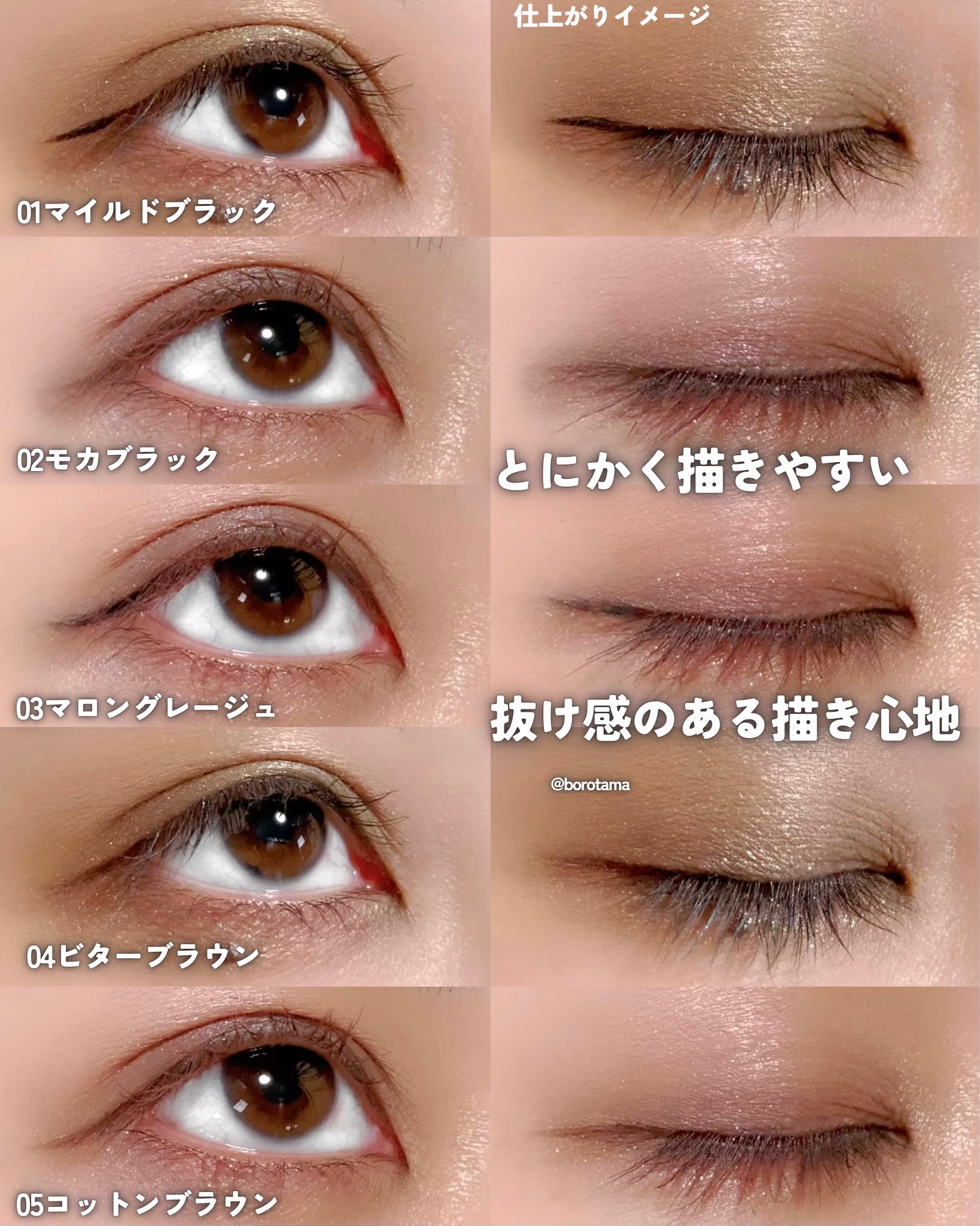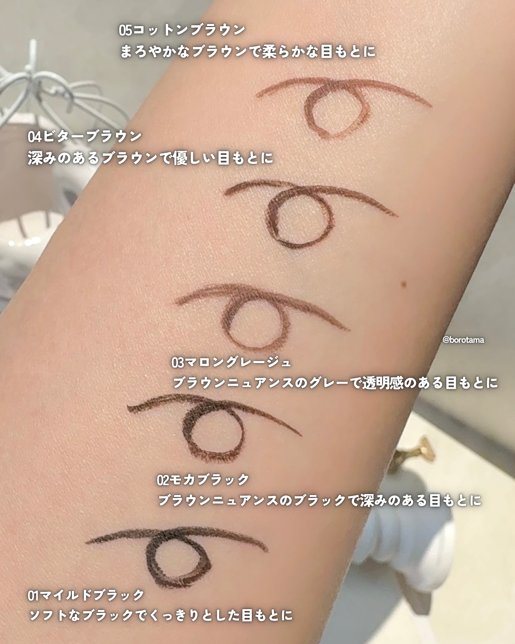 - <01 マイルドブラック> 水、BG、(アクリル酸エチルヘキシル/メタクリル酸メチル)コポリマー、(アクリレーツ/メチルスチレン/スチレン)コポリマーアンモニウム、ポリアスパラギン酸Na、1,2-ヘキサンジオール、ヒアルロン酸Na、ベヘネス-30、水酸化Al、EDTA-2Na、エチルヘキシルグリセリン、トコフェロール、セテス-20、フェノキシエタノール、メチルパラベン、エチルパラベン、デヒドロ酢酸Na、酸化チタン、カーボンブラック、酸化鉄 <02 モカブラック> 水、BG、(アクリル酸エチルヘキシル/メタクリル酸メチル)コポリマー、(アクリレーツ/メチルスチレン/スチレン)コポリマーアンモニウム、1,2-ヘキサンジオール、ポリアスパラギン酸Na、ヒアルロン酸Na、ベヘネス-30、セテス-20、EDTA-2Na、水酸化Al、エチルヘキシルグリセリン、トコフェロール、フェノキシエタノール、メチルパラベン、エチルパラベン、デヒドロ酢酸Na、酸化鉄、カーボンブラック <03 マロングレージュ> 水、BG、(アクリル酸エチルヘキシル/メタクリル酸メチル)コポリマー、ポリアスパラギン酸Na、(アクリレーツ/メチルスチレン/スチレン)コポリマーアンモニウム、1,2-ヘキサンジオール、ヒアルロン酸Na、水酸化Al、ベヘネス-30、セテス-20、EDTA-2Na、フェノキシエタノール、メチルパラベン、エチルパラベン、デヒドロ酢酸Na、酸化チタン、酸化鉄、カーボンブラック <04 ビターブラウン> 水、BG、(アクリル酸エチルヘキシル/メタクリル酸メチル)コポリマー、(アクリレーツ/メチルスチレン/スチレン)コポリマーアンモニウム、ポリアスパラギン酸Na、ヒアルロン酸Na、セテス-20、水酸化Al、エチルヘキシルグリセリン、EDTA-2Na、クエン酸、トコフェロール、フェノキシエタノール、メチルパラベン、エチルパラベン、酸化鉄 <05 コットンブラウン> 水、BG、(アクリル酸エチルヘキシル/メタクリル酸メチル)コポリマー、(アクリレーツ/メチルスチレン/スチレン)コポリマーアンモニウム、ポリアスパラギン酸Na、1,2-ヘキサンジオール、ヒアルロン酸Na、水酸化Al、クエン酸、セテス-20、エチルヘキシルグリセリン、EDTA-2Na、トコフェロール、フェノキシエタノール、メチルパラベン、エチルパラベン、酸化鉄、酸化チタン <06 チェリーブラック> 水、BG、(アクリル酸エチルヘキシル/メタクリル酸メチル)コポリマー、1,2-ヘキサンジオール、(アクリレーツ/メチルスチレン/スチレン)コポリマーアンモニウム、セテス-20、べヘネス-30、フェノキシエタノール、ポリアスパラギン酸Na、メチルパラベン、エチルパラベン、水酸化Al、EDTA-2Na、AMP、デヒドロ酢酸Na、ヒアルロン酸Na、赤226、酸化チタン、カーボンブラック、酸化鉄