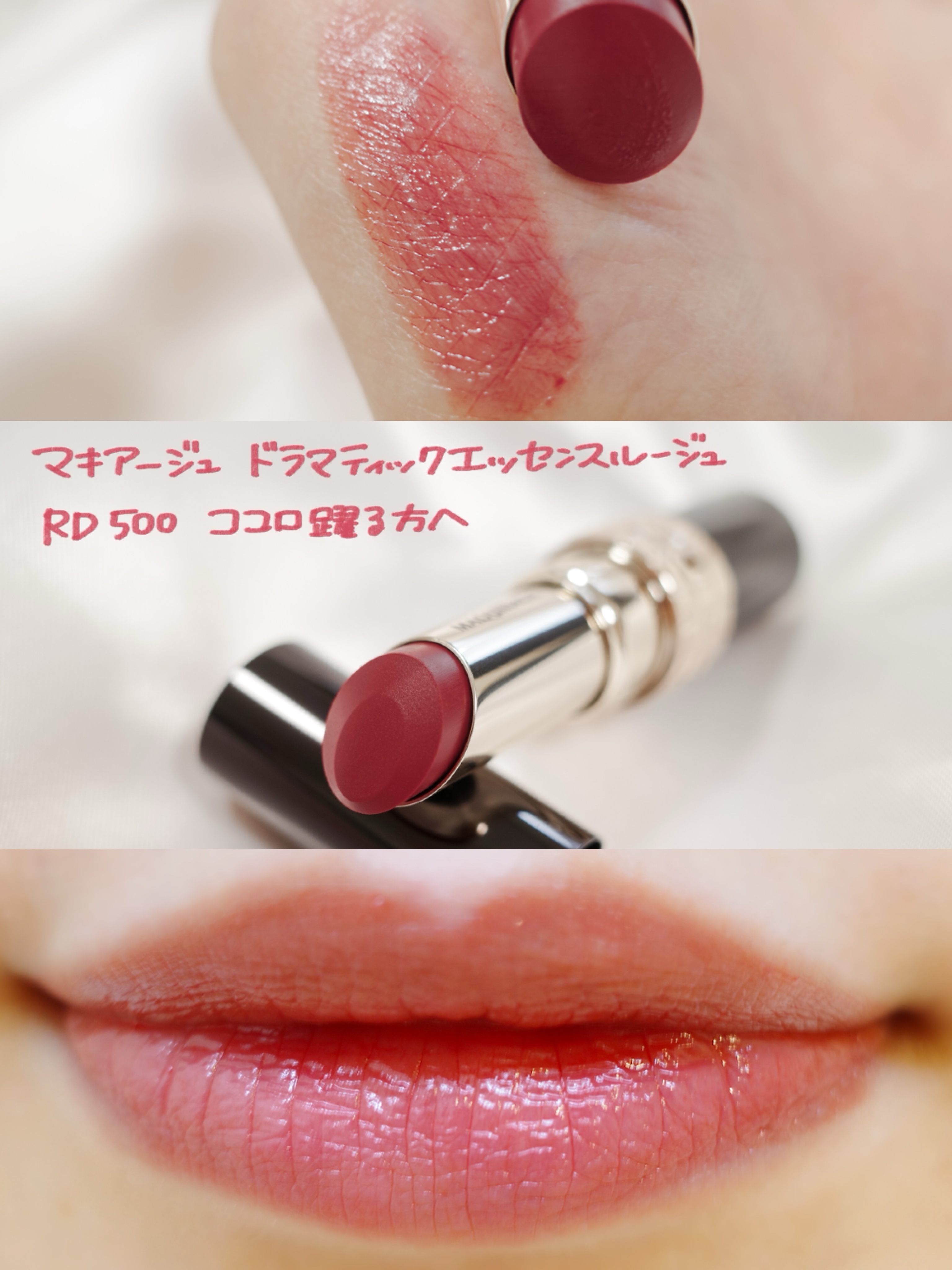 マキアージュさまからいただきました。マキアージュ ドラマティックエッセンスルージュPK700飾らない主張RD500ココロ躍る方へBR300マイルールどれも色名がおしゃれ✨塗るときは唇の上に1、2秒置いてから塗りひろげるとじゅわっととろけるよう...
