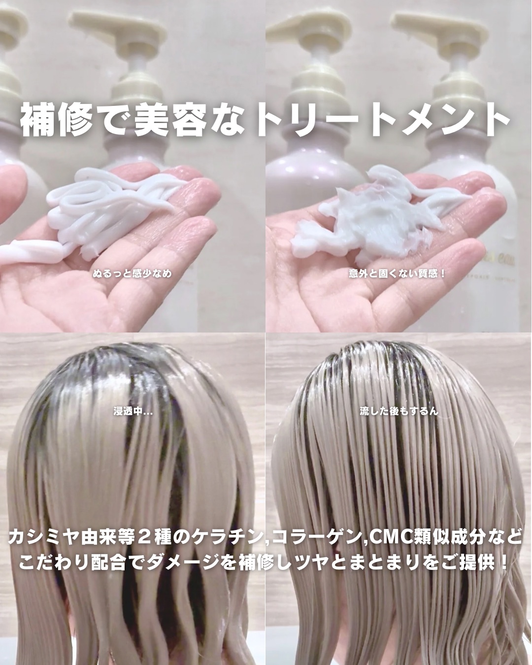 - とろけるような質感と、ダメージでパサつきがちな髪も毛先までツヤめくしっとり髪へ導く美容液シャンプー&光沢補修トリートメント。 より浸透性が高くなるカプセル化技術を採用したシルクリポカプセルを補修成分として配合。 髪の芯まで徹底補修しながらキューティクルをなめらかに整え、しっとりと潤いツヤめく髪へと導きます。 また洗いながらも髪ダメージを補修するPPT系洗浄成分を、シリーズ比で高濃度に配合。 シルク由来PPT系洗浄成分と、肌のことを考えたアミノ酸系の4種の洗浄成分とバランスよくブレンドすることでキメ細かな濃密補修泡が摩擦レスでリッチな洗い心地を実現し、髪と頭皮をいたわりながらシャンプーでも毛髪ダメージに徹底アプローチします。 カシミヤ由来のケラチンをはじめとする2種のケラチン、コラーゲン、CMC類似成分などのこだわり配合した補修成分だけでなく、美容保湿成分をたっぷり浸透させて密封補修することで、カラーや熱ダメージによるパサつき・広がり・ゴワつきなどの蓄積ダメージもしっかりケア。 ドライヤーやヘアアイロンの熱ダメージから髪を守りツヤを与える、ヒートリペア成分を配合して熱も味方に。 清楚な上品さを纏うホワイトフローラル&ペア―の香り。 2024年10月中旬 一部企業にて先行発売