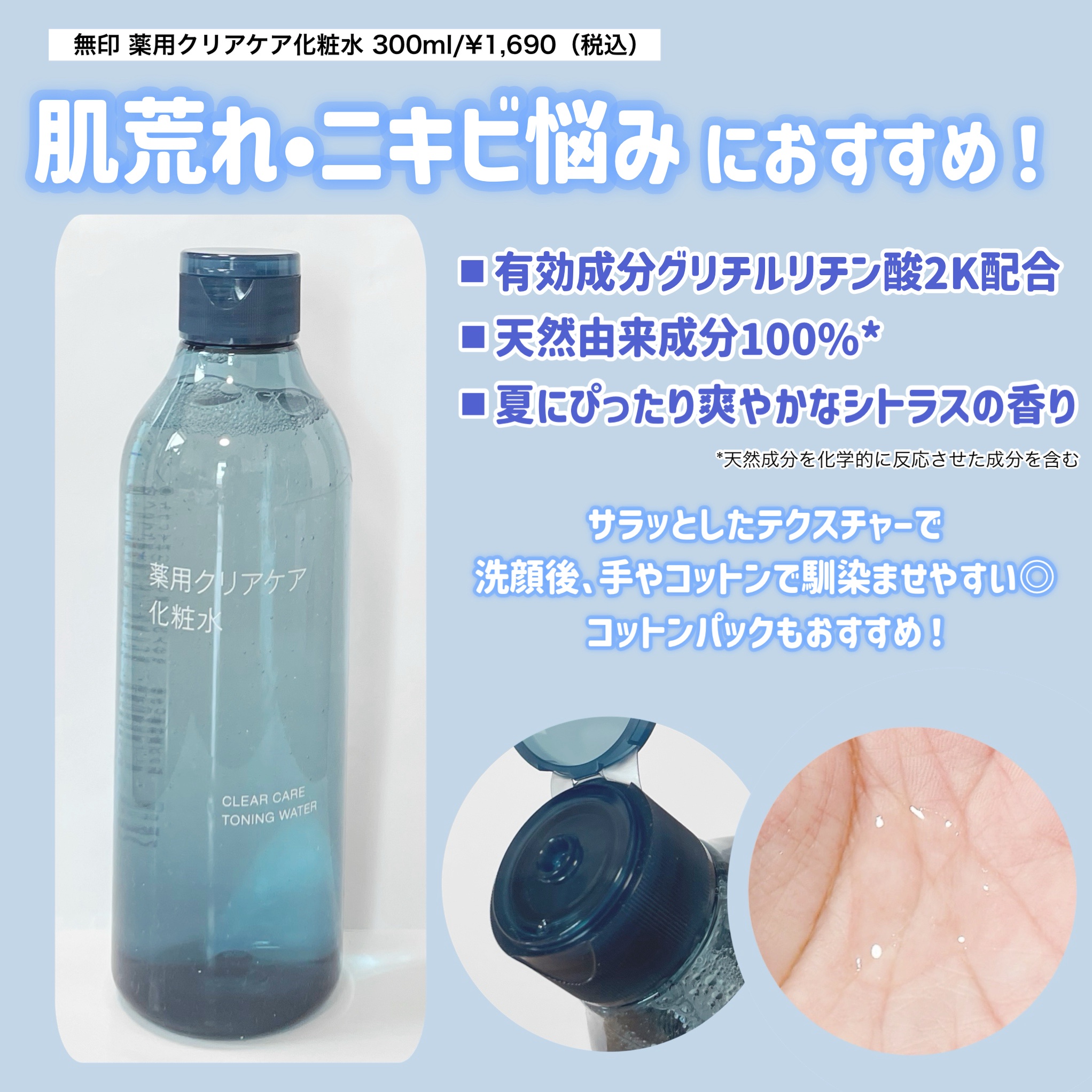 無印良品薬用クリアケア化粧水300ml¥1,690ニキビ・肌荒れの方向けシリーズ有効成分としてグリチルリチン酸2K配合液はシャバシャバ系かとおもってたけどすこしだけトロミを感じるでもコットンパックとかでもいける感じ高保湿ではないけどそれなりに...