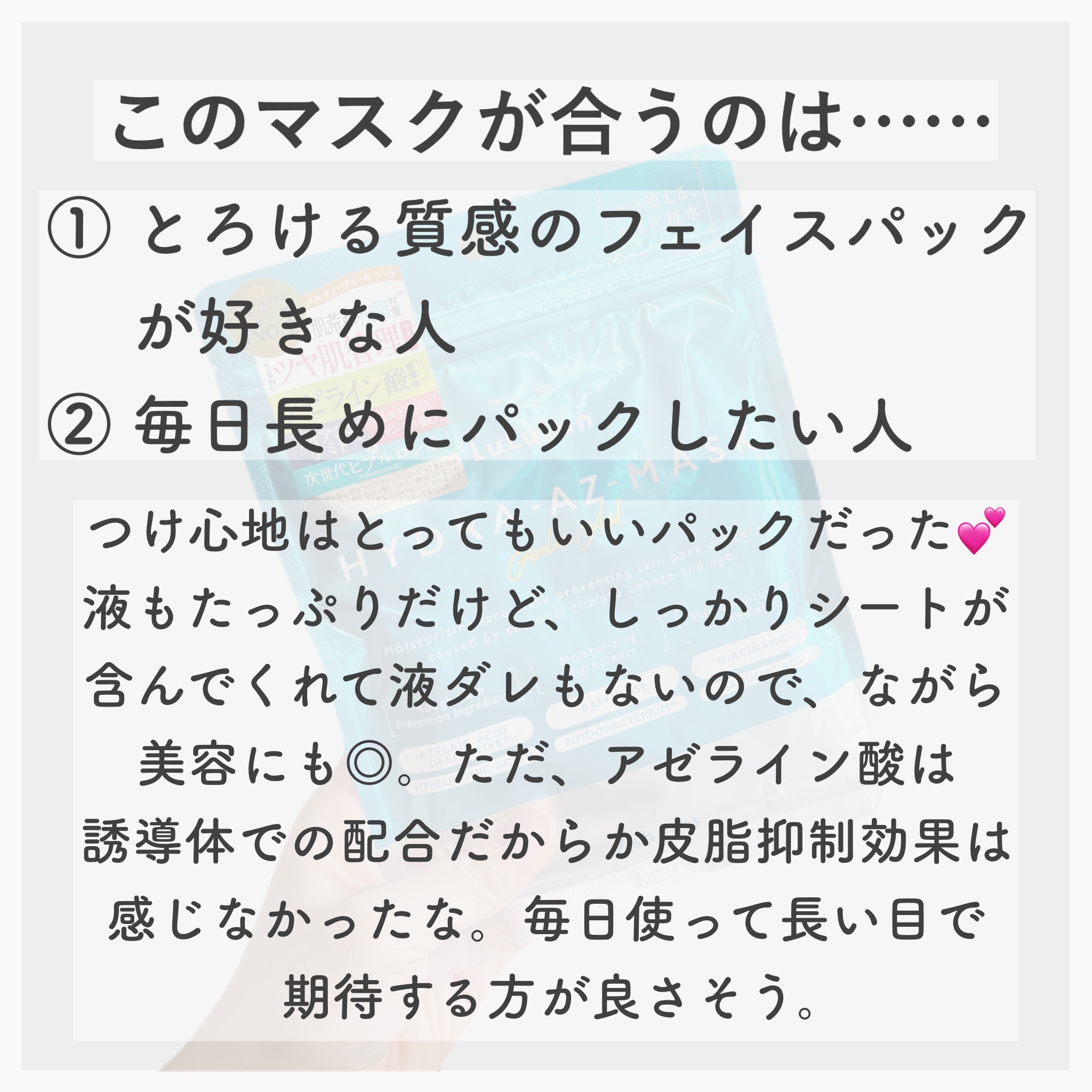 - 肌荒れ・皮脂ケア※1と健やかな肌の土台※2美容を叶える、アゼライン酸誘導体*1配合のうるおいツヤ肌管理マスクです。 肌荒れや肌の赤み、毛穴目立ちが気になる方に。 アゼライン酸*1×ナイアシンアミド*2+次世代ヒアルロン酸*3配合で、肌荒れをケアし、角質層をみずみずしいうるおいで満たします。 さらに肌表面でゆっくりと働くマイルドAHA*4が、古い角質をやわらげ、キメを整えることで、つるんとツヤめく素肌へ導きます。 シートはとろけるように肌に密着するメルティーフィールシートを採用。 シートが最も柔らかく感じられる液量を研究し、まるで水の層に包まれているような心地よさを実現しています。 (※1 ふき取りによる ※2 角質層のこと *1 肌荒れ防止成分 アゼロイルジグリシンK *2 整肌成分 *3 肌荒れ防止成分 加水分解ヒアルロン酸Na *4 整肌成分 マンデル酸)