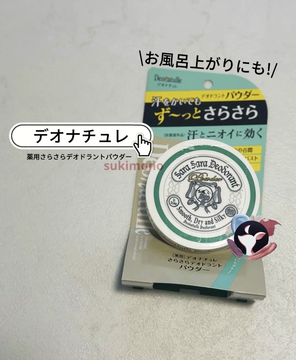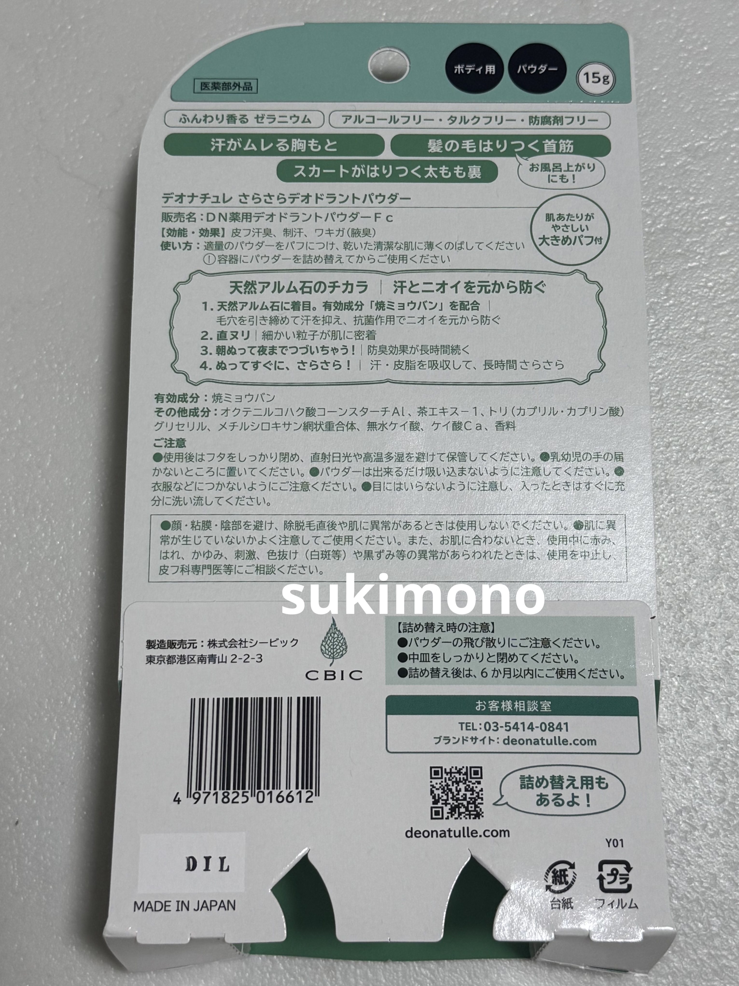 - \11年間ず~っと売上No.1*直ヌリ制汗デオドラントブランド/ 『防臭力のデオナチュレ』シリーズから、ボディ用制汗・防臭パウダー 「薬用デオナチュレ さらさらデオドラントパウダー」 ボディのベタ汗・ムレ・ニオイを防ぐ 合成香料・着色料・アルコール・タルク・防腐剤 無配合 ◆◆汗っかきさん、その胸の谷間のベタ汗は、ニオイの原因に!◆◆ ・胸の谷間、アンダーバストのベタ汗を防いで、ニオイも抑える ・首筋、太もも裏のベタつきにも ◆◆ユーザーから選ばれる理由◆◆ 1.天然アルム石に着目。有効成分「焼ミョウバン」を配合し、汗・ニオイを元から防ぐ! 「薬用デオナチュレ さらさらデオドラントパウダー」は、有効成分「焼ミョウバン」を配合 さらに、皮脂吸収さらさらパウダー**が汗や皮脂を吸収して長時間ベタつかない 2.大判パフで、“直ヌリ”で肌さらさら!さらさら感、続いちゃう! 3.つけるときに、ほんのり香る、天然ゼラニウムの香り ==注意== ●顔・粘膜・陰部を避け、除脱毛直後や肌に異常があるときは使用しないでください。●肌に異常が生じていないかよく注意してご使用ください。また、お肌に合わないとき、使用中に赤み、はれ、かゆみ、刺激、色抜け(白斑等)や黒ずみ等の異常があらわれたときは、使用を中止し、皮フ科専門医等にご相談ください。●使用後はフタをしっかり閉め、直射日光や高温多湿を避けて保管してください。●乳幼児の手の届かないところに置いてください。●パウダーは出来るだけ吸い込まないように注意してください。●衣服などにつかないようにご注意ください。●目にはいらないように注意し、入ったときはすぐに充分に洗い流してください。 【詰め替え時の注意点】 ・パウダーの飛び散りにご注意ください。 ・中皿をしっかりと閉めてください。 ・詰め替え後は、6か月以内にご使用ください。 販売名:DN薬用デオドラントパウダーFc *インテージSRI+制汗剤市場 2013年5月~2024年4月 ソフトストーンW(販売名:デオナチュレソフトストーンEX(リニューアル前処方)・DN薬用スティックFe)累計販売金額 **基剤:無水ケイ酸、基剤:ケイ酸Ca