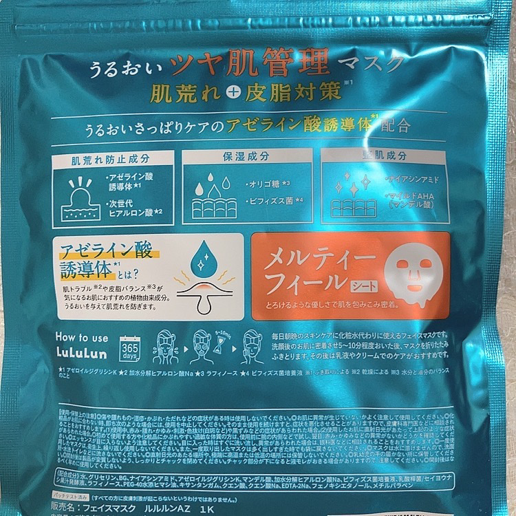 - 肌荒れ・皮脂ケア※1と健やかな肌の土台※2美容を叶える、アゼライン酸誘導体*1配合のうるおいツヤ肌管理マスクです。 肌荒れや肌の赤み、毛穴目立ちが気になる方に。 アゼライン酸*1×ナイアシンアミド*2+次世代ヒアルロン酸*3配合で、肌荒れをケアし、角質層をみずみずしいうるおいで満たします。 さらに肌表面でゆっくりと働くマイルドAHA*4が、古い角質をやわらげ、キメを整えることで、つるんとツヤめく素肌へ導きます。 シートはとろけるように肌に密着するメルティーフィールシートを採用。 シートが最も柔らかく感じられる液量を研究し、まるで水の層に包まれているような心地よさを実現しています。 (※1 ふき取りによる ※2 角質層のこと *1 肌荒れ防止成分 アゼロイルジグリシンK *2 整肌成分 *3 肌荒れ防止成分 加水分解ヒアルロン酸Na *4 整肌成分 マンデル酸)