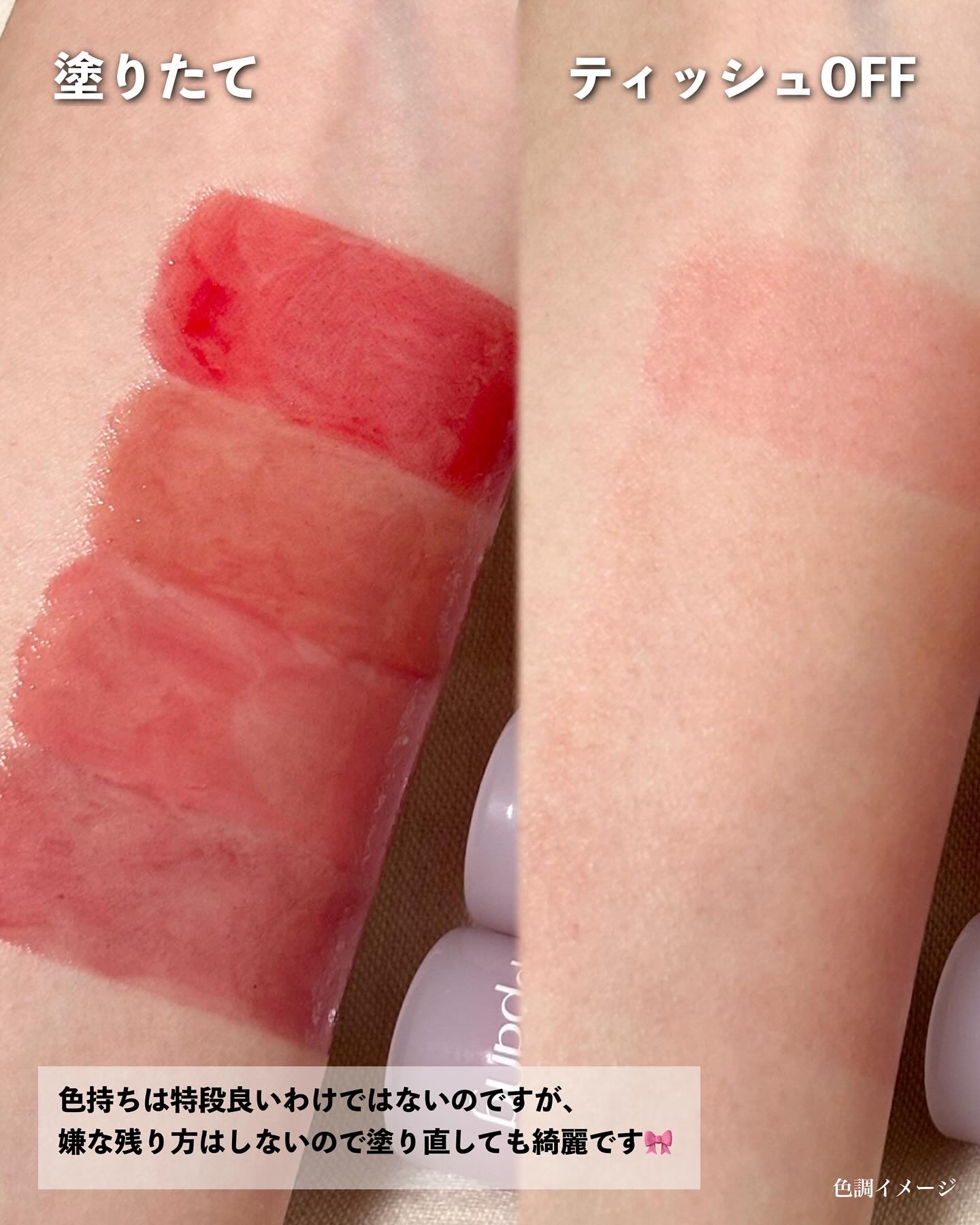 | リップティントランキング第3位 | 重ねて塗っても、ちゅるんと透け感が残って明るめカラーがとっても映える…💕色残りも◎ | 詳細を見る | ||