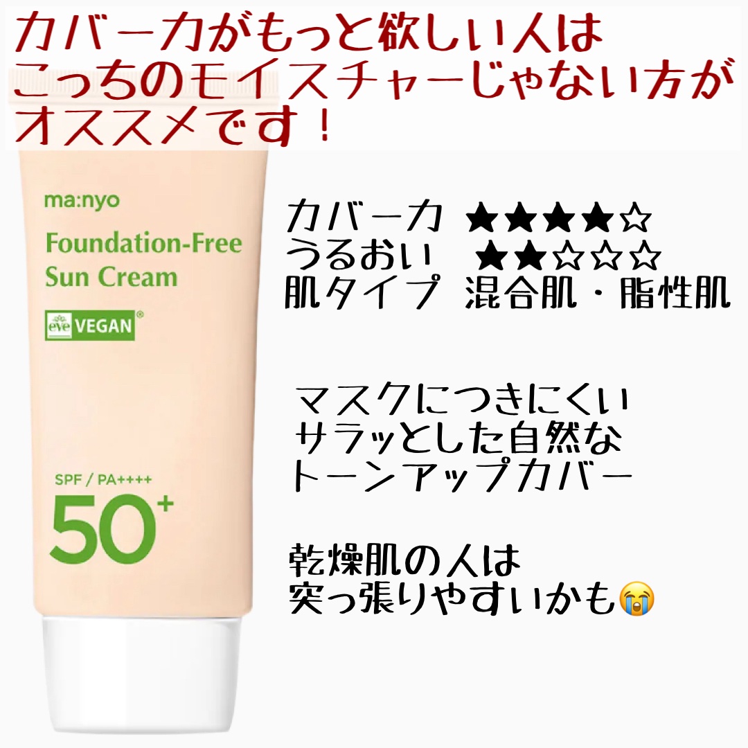 manyoファンデフリーサンクリームモイスチャー¥2,800カバー力良し!自然にトーンアップもしてくれてなにより保湿されるのが◎化粧前のスキンケアは割とさっぱり目が好みで…(めちゃくちゃ乾燥肌)なので下地は保湿感があるものでないと顔面砂漠にな...