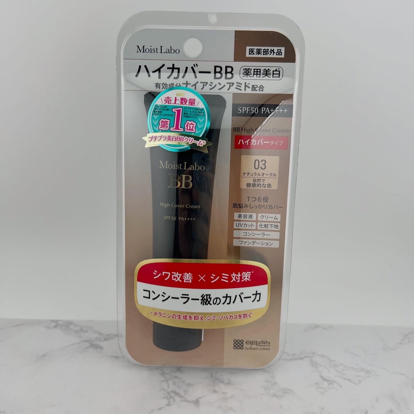 - 【医薬部外品】 「モイストラボ ハイカバー薬用美白BBクリーム」は薄付きなのにコンシーラー級のカバー力でしっかりとシミなどの肌悩みを隠しながら、同時にナイアシンアミド配合でつけている間中シワを改善し、美白対策もできる画期的なBBクリームです。 当社独自のモイスチャーマグネットHC配合でうるおい成分が密着し続け、リペアプロテクトCR配合でバリア効果も発揮。 1本6役(美容液・クリーム・UVカット・化粧下地・コンシーラー・ファンデーション)なので時短メイクなのに美しい仕上がりが叶います。 汗・水に強いウォータープルーフタイプでSPF50・PA++++なので春夏のメイクにも最適です。 〇薄膜で均一に仕上がり、厚塗り感なくシミ・くすみ・毛穴をしっかりカバー 〇密着カバーしながら、シワ改善と美白が同時に叶う 〇サラッとセミマット肌で崩れにくい 〇美白ケアしながらうるおう 〇コンシーラーいらずで1本でベースメイク完了 〇1本で6つの効果(美容液・クリーム・UVカット・化粧下地・コンシーラー・ファンデーション) 〇肌を守るバリア効果 〇汗・水に強いウォータープルーフタイプ 〇SPF50 PA++++