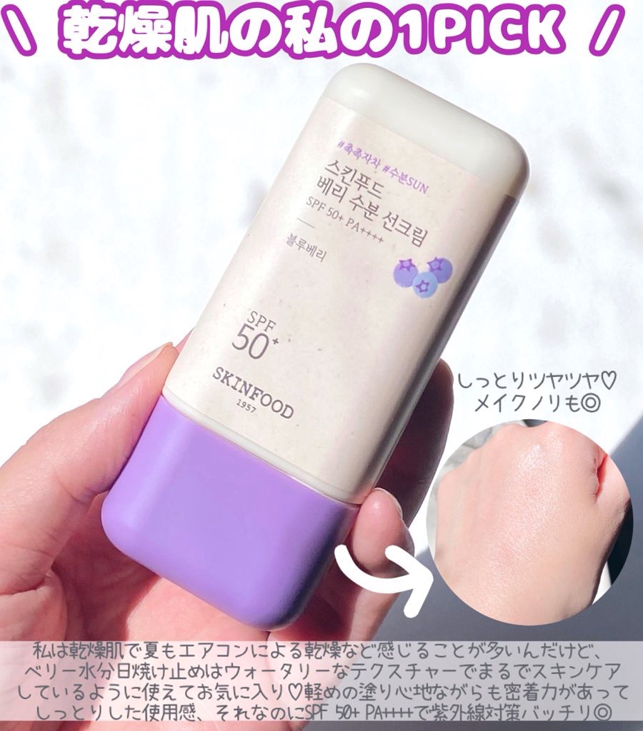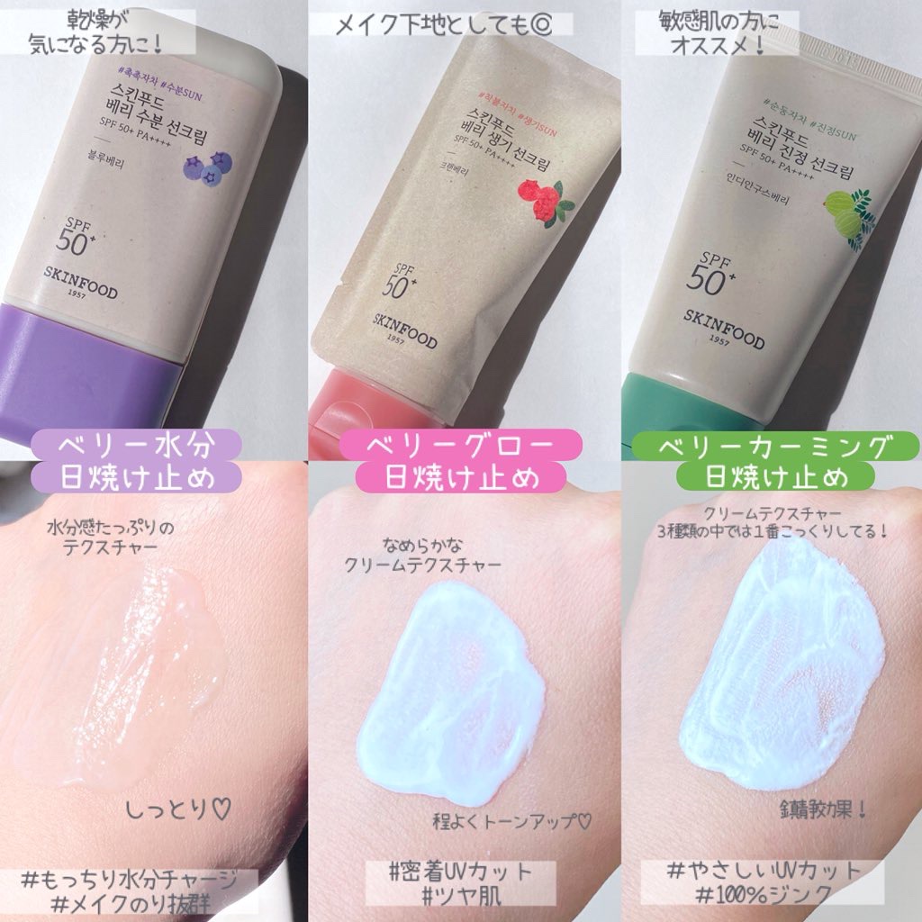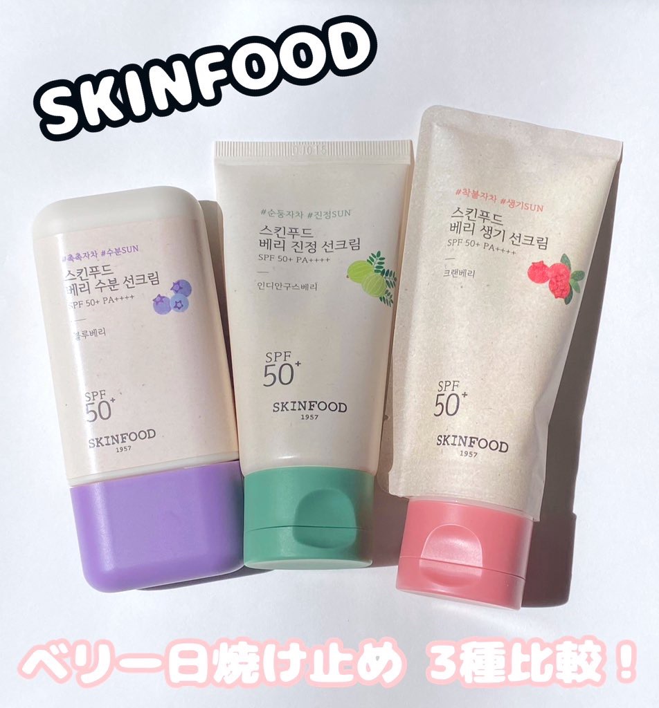 SKINFOOD▶︎BerryMoisturizingSunCream🫐▶︎BerrySoothingSunCream🌿▶︎BerryGlowingSunCream🍓話題のベリー日焼け止め比較してみたよ◎どれも良過ぎて迷っちゃう🔥有機、無機、...