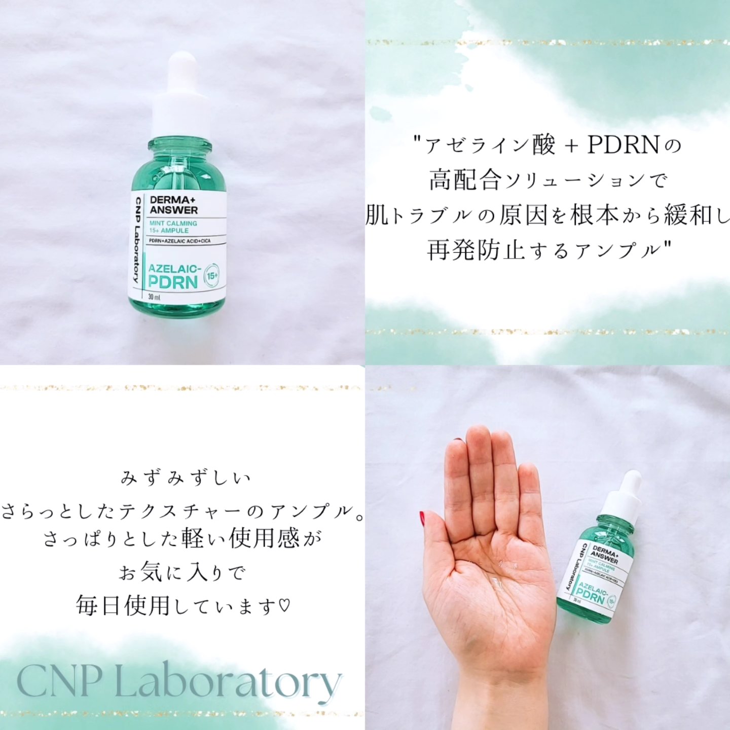 15%高配合ソリューション ミントカーミングアンプル アゼライン酸+ PDRNの高配合ソリューションで肌トラブルの原因を根本から緩和し、ほんの3秒でスピードカーミングが可能なアンプル✨️ CNP過去最高配合、純度98% PDRN アゼライン酸 15% ソリューション 15%強力処方で肌トラブルの原因を一斉に緩和 サラッとしたテクスチャーのアンプルでベタつかず肌馴染み良し🙆♀️ ニキビケアが必要な肌、トラブルが頻繁に起こる肌敏感且つ刺激に弱い肌の方にオススメだよ💚