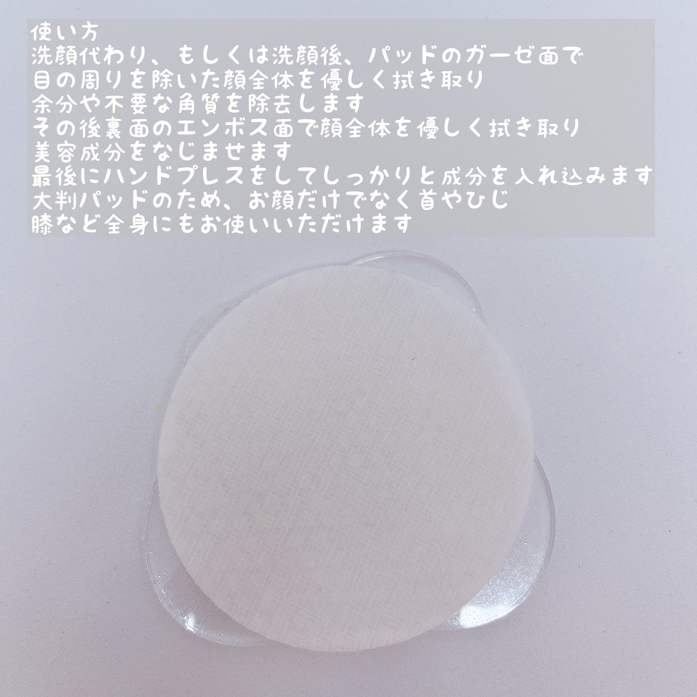 - ①独自処方の2面パッドで角質+保湿へダブルアプローチ まずガーゼ面(ザラザラ面)で不要な角質や皮脂、毛穴汚れをスッキリ落とします。このガーゼ素材は実は優しく拭き取るだけで不要な角質や汚れを落とすだけでなく、ターンオーバーに着目して開発されています。次にエンボス面で、クリアになった素肌を優しく保湿。角質層までたっぷりの美容成分を届けてしっとり潤いを与えます。忙しいママさんも、スボラ女子さんも、男性も、これ1枚で簡単30秒ケア!簡単だからこそ毎日続けられる!継続こそが素肌美人への近道! ②主成分が水ではなくCICA 多くの化粧品の主成分は8〜9割が水であるのに対し、AKASURI PADの主成分は美容成分で肌管理の『CICA(シカ)』 ③イデベノン配合 エイジングケアの代表格『ヒト幹細胞』や『ナイアシンアミド』に加え、次世代成分『イデベノン』配合。なんとビタミンCの4倍、コエンザイムQ10の10倍も若さと健康をケアする成分であるため、美容大国韓国では大注目成分である。 ④簡単30秒ケアで高タイパ 1枚たったの30秒ケアで、洗顔・化粧水・美容液まで完結できる『美容液パッド』はコスパもタイパも最高!