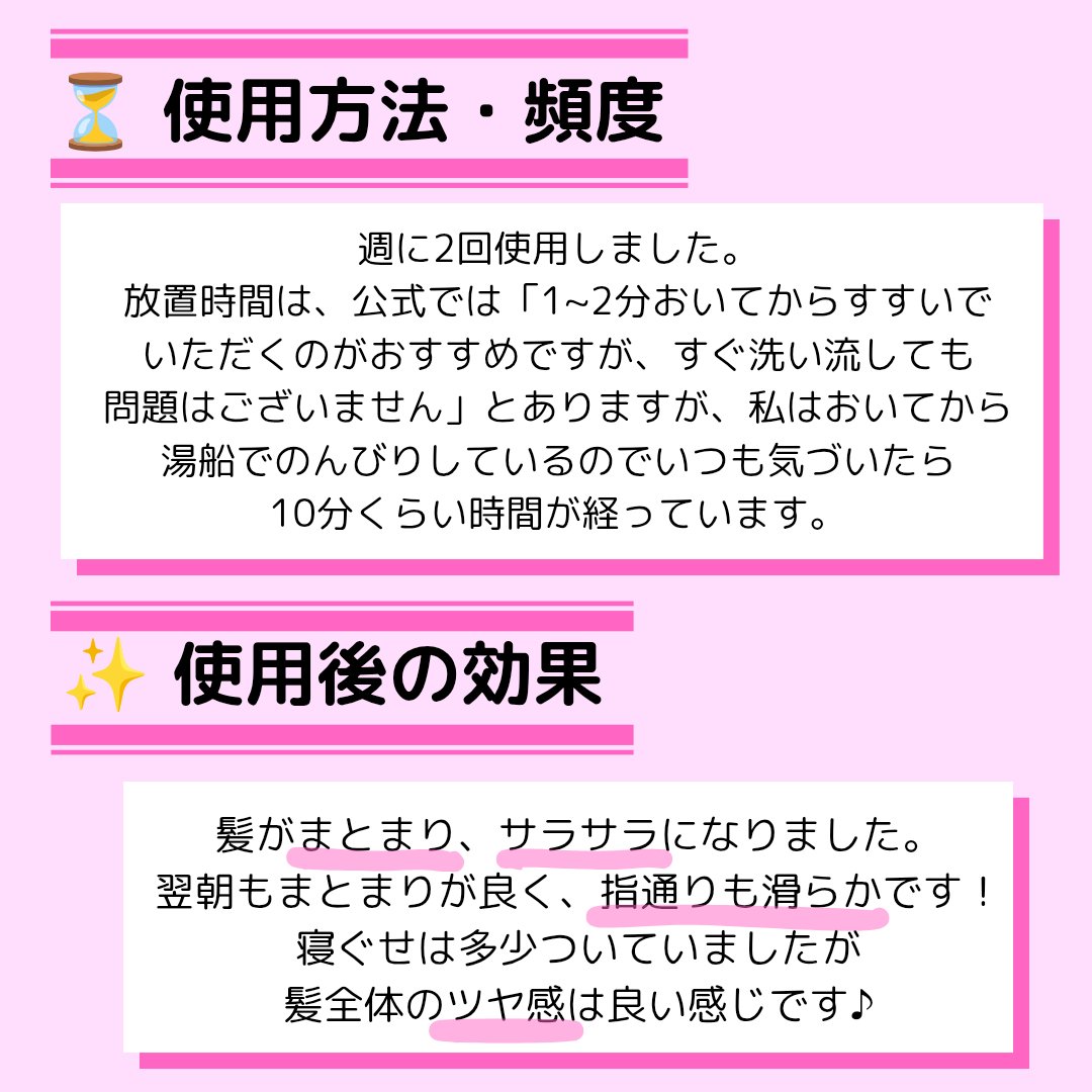 | ヘアマスク・ヘアパックランキング第51位 | 毛先までまとまる指通りの良いつやつや髪になり嬉しかったです😊 | 詳細を見る | |
