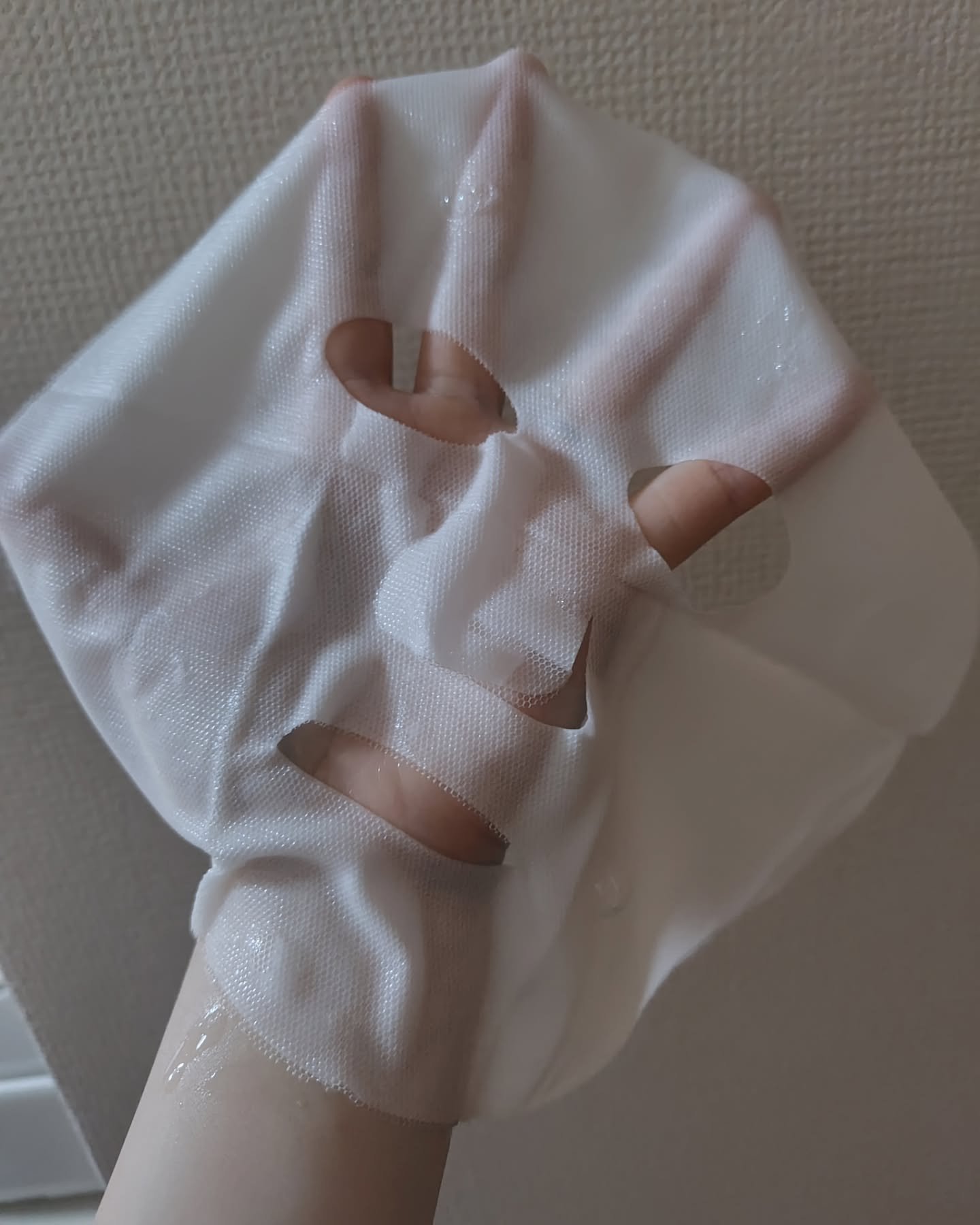 はずしたあとは顔になじませてもちもちに♡ マスクに残ったものも首まわりに使うと◎ お肌が生き返ったような使い心地でした♬ 化粧水でお肌のキメを整えてから使う薄手のマスクで、 液垂れせずお肌にピタッと密着してくれたよ! 忙しい朝はササッと3-5分程度、 時間がとれる日は10-20分位じっくりつけるよ◎