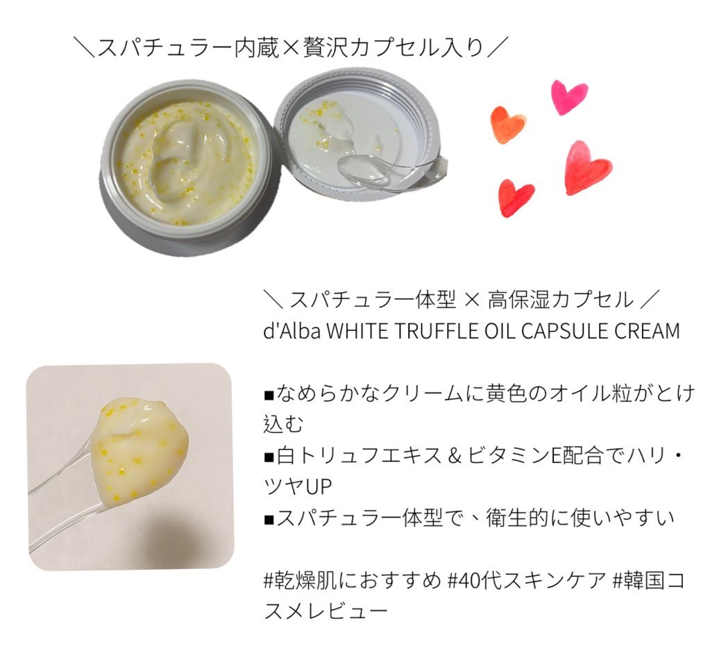 - ※リニューアル発売:旧称「ホワイトトリュフオイル カプセルクリーム」 ハリのあるお肌へ、保湿ダブルレイヤリングフォーミュラ - 溶け込むようになめらかに塗る密着保湿ベースと保湿光彩オイルカプセルが調和し、お肌にハリを与えます。 ローリングするほど明るく輝く光彩を放つVita-Cera Oil Capsule - セラミドとダルバブレンド-8オイルの強力な保湿でお肌をなめらかにするオイルカプセル 特許取得済みの無膜カプセルで残り感はZERO、甦る保湿光彩 - 特許を取得したメンブレン工法の無膜カプセルで、異物感なく素早く浸透し、しっかりとしたツヤ肌を実現します。 【ご使用方法】 適量を手にとり、肌にのばした後、手でやさしくこすりながらなじませます。 【使用上の注意】 お肌に異常が生じていないかよく注意して使用してください。 化粧品がお肌に合わないとき即ち次のような場合には、使用を中止してください。 そのまま使用を続けますと、症状を悪化させることがありますので、皮ふ科専門医等にご相談されることをおすすめします。 (1)使用中、赤味、はれ、かゆみ、刺激、色抜け(白斑等)や黒ずみ等の異常があらわれた場合 (2)使用したお肌に、直射日光があたって(1)のような異常があらわれた場合