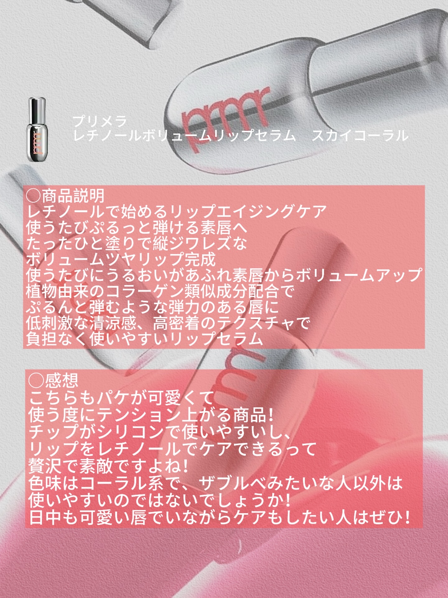 唇のエイジングケアをしながら、唇の血色感&ボリューム感*3まで演出できる点が気に入っています♡ 韓国の大手化粧品メーカー「アモーレパシフィック」の新ブランド「プリメラ」のレチノール*2入りリップセラム。