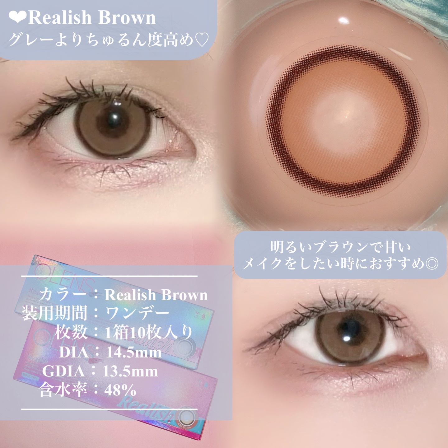 \OLENS新作デカ目カラコン比較🫶🏼🖤/▷OLENS■RealishGray、Brown🆕1Day(1箱10枚入り)DIA14.5mmGDIA13.5mmWATER48%透明感のあるトーンアップカラーと太フチでラブリーな目元を演出する#デカ...