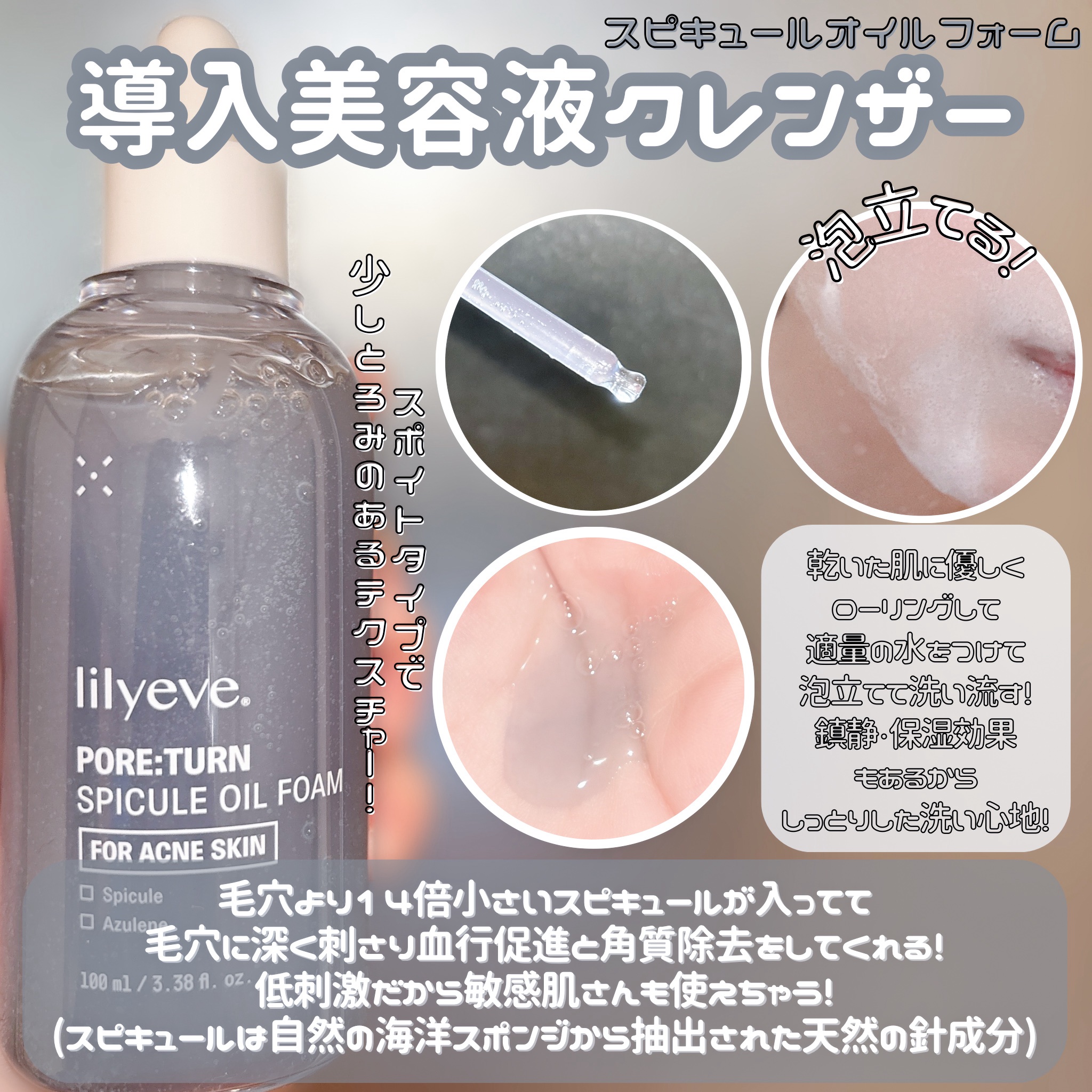 天然スピキュール配合、新発想の導入美容液クレンザーなんです。オイルで毛穴の中の汚れを溶かし、泡で汚れをきれいに取り除きます。 毛穴より14倍小さく、毛穴に深く刺さってしっかり開き、血行促進と角質除去を行い、肌を鎮静させ回復力を高める鎮静特許成分のDermatic ACとグアイアズレンも配合。 おしゃれなブルーデザインボトル。爽やかな良い香りがほんのりします。とろみのあるテクスチャーで伸び馴染みがなめらかでした。