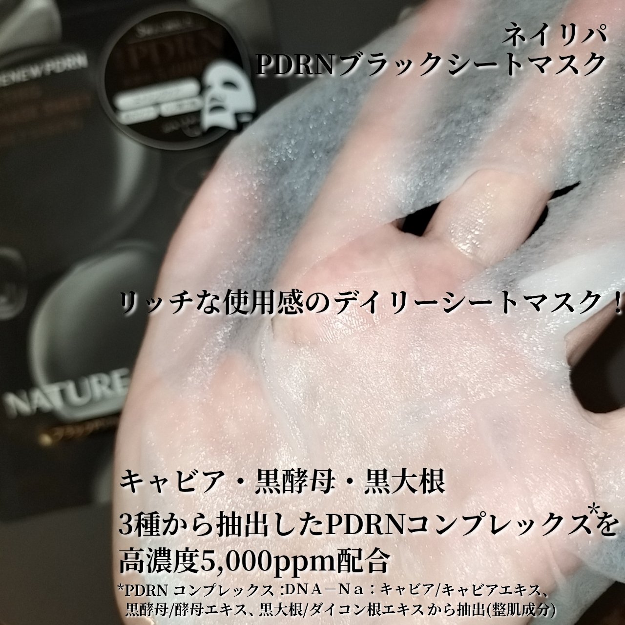 ♡••••♡ネイチャーリパブリックブラックPDRNデイリーシートマスク♡••••♡キャビア(動物由来)+黒大根(植物由来)+黒酵母(菌由来)由来のPDRN※配合でハリを与えるような肌印象のケアが期待できる!👍✨PDRN※Complexを5,0...