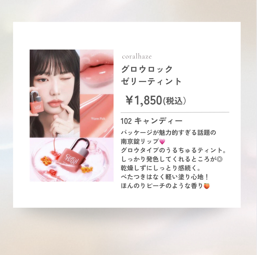 南京錠のパケがめちゃくちゃかわいくないですかー?💕 カバンにキーホルダー代わりにつけて持ち運べるかわいらしさが特徴のこちらはやわらかくぷるんとしたジェリーテクスチャーが唇に触れた瞬間、プランピング成分なしでツヤ感とボリュームを演出してくれるティント。 韓国コスメブランド・コーラルヘイズの個性的な10色でどんなパーソナルカラーにもピッタリのムードに✨ なんといってもカバンにつけて持っていけるってのがかわいくていいなと思いました💕