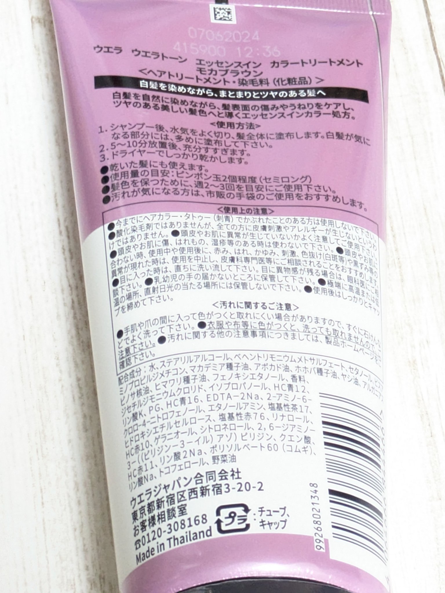 - <キャラメルブラウン> 水、ステアリルアルコール、ベヘントリモニウムメトサルフェート、セタノール、ビスアミノプロピルジメチコン、マカデミア種子油、ホホバ種子油、アボカド油、ヤシ油、アルガニアスピノサ核油、ヒマワリ種子油、フェノキシエタノール、香料、ジセチルジモニウムクロリド、イソプロパノール、HC青12、リン酸K、2−アミノ−6−クロロ−4−ニトロフェノール、PG、EDTA-2Na、エタノールアミン、ヒドロキシエチルセルロース、塩基性赤76、塩基性茶17、HC青16、リナロール、ゲラニオール、シトロネロール、HC赤10、2,6-ジアミノ-3-((ピリジン-3-イル)アゾ)ピリジン、クエン酸、HC赤11、リン酸2Na、ポリソルベート60(コムギ)、リン酸Na、トコフェロール、野菜油 <モカブラウン> 水、ステアリルアルコール、ベヘントリモニウムメトサルフェート、セタノール、ビスアミノプロピルジメチコン、マカデミア種子油、アボカド油、ホホバ種子油、ヤシ油、アルガニアスピノサ核油、ヒマワリ種子油、フェノキシエタノール、香料、ジセチルジモニウムクロリド、イソプロパノール、HC青12、リン酸K、PG、HC青16、EDTA-2Na、2−アミノ−6−クロロ−4−ニトロフェノール、エタノールアミン、塩基性茶17、ヒドロキシエチルセルロース、塩基性赤76、リナロール、HC赤10、ゲラニオール、シトロネロール、2,6-ジアミノ-3-((ピリジン-3-イル)アゾ)ピリジン、クエン酸、HC赤11、リン酸2Na、ポリソルベート60(コムギ)、リン酸Na、トコフェロール、野菜油 <アッシュブラック> 水、ステアリルアルコール、ベヘントリモニウムメトサルフェート、セタノール、ビスアミノプロピルジメチコン、マカデミア種子油、アボカド油、ホホバ種子油、ヤシ油、アルガニアスピノサ核油、ヒマワリ種子油、フェノキシエタノール、HC青12、香料、ジセチルジモニウムクロリド、イソプロパノール、リン酸K、HC青16、PG、EDTA-2Na、エタノールアミン、2−アミノ−6−クロロ−4−ニトロフェノール、ヒドロキシエチルセルロース、HC赤10、塩基性茶17、HC赤11、塩基性赤76、リナロール、ゲラニオール、シトロネロール、クエン酸、2,6-ジアミノ-3-((ピリジン-3-イル)アゾ)ピリジン、リン酸2Na、ポリソルベート60(コムギ)、リン酸Na、トコフェロール、野菜油