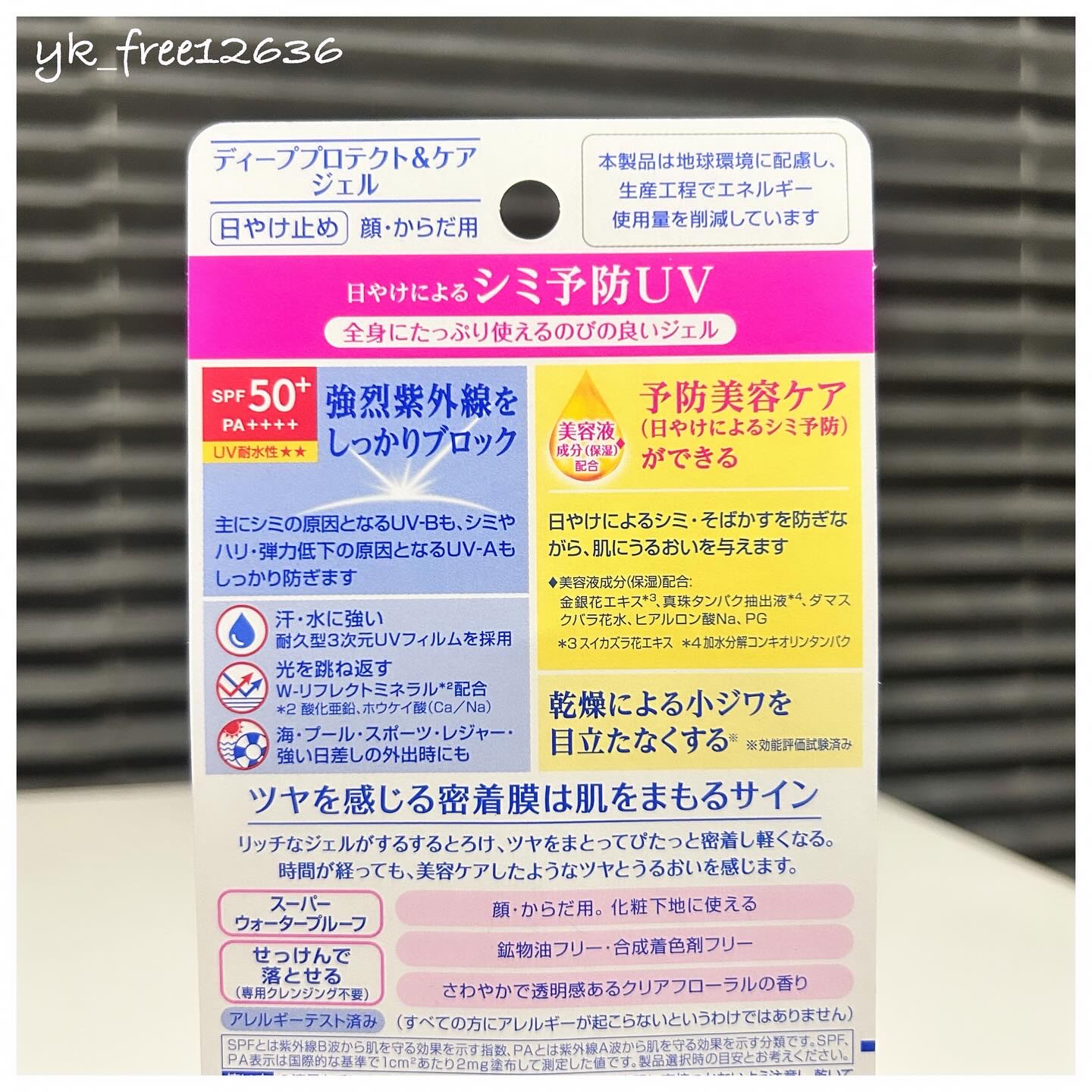 - 全身たっぷり使えるのびのいいジェル 強力紫外線をしっかりブロックしながら、予防美容(日やけによるシミ予防*1)ができる美容ケアUV *1日やけによるシミ・ソバカスを防ぐ ■SPF50+/PA++++ ハリ・弾力低下の原因となるUV-Aも、主にシミの原因となる UV-Bも防ぎます。 ■汗・水に強い3次元UVフィルムを採用 スーパーウォータープルーフで汗・水に触れても強力紫外線をカットします。(80分間の耐水試験で確認済み) ●日やけによるシミ・そばかすを防ぎながら、肌にうるおいを与えます。美容液成分★(保湿)配合。 ★ジェル:金銀花エキス*5、真珠タンパク抽出液*6、ダマスクバラ花水、BG ★エッセンス: 金銀花エキス*5、真珠タンパク抽出液*6、チューベロース多糖体、BG *5スイカズラ花エキス *6 加水分解コンキオリン ●乾燥による小ジワを目立たなくする*3 *3効能評価試験済み ●さわって驚く密着感とうるおい感のある使い心地