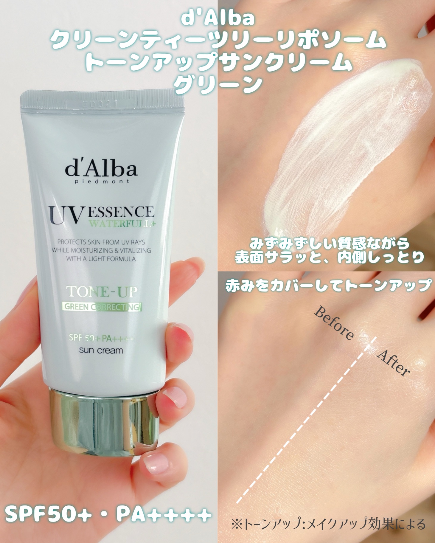 @dalba_japanウォータフルトーンアップサンクリーム一本でベースメイク完成するd'Albaの色で選べる日焼け止め3種・ピンク血色感を出したい時、ナチュラルに仕上げたい日初心者向けのアイテム・パープル補色効果で黄ぐすみを抑えトーンアッ...