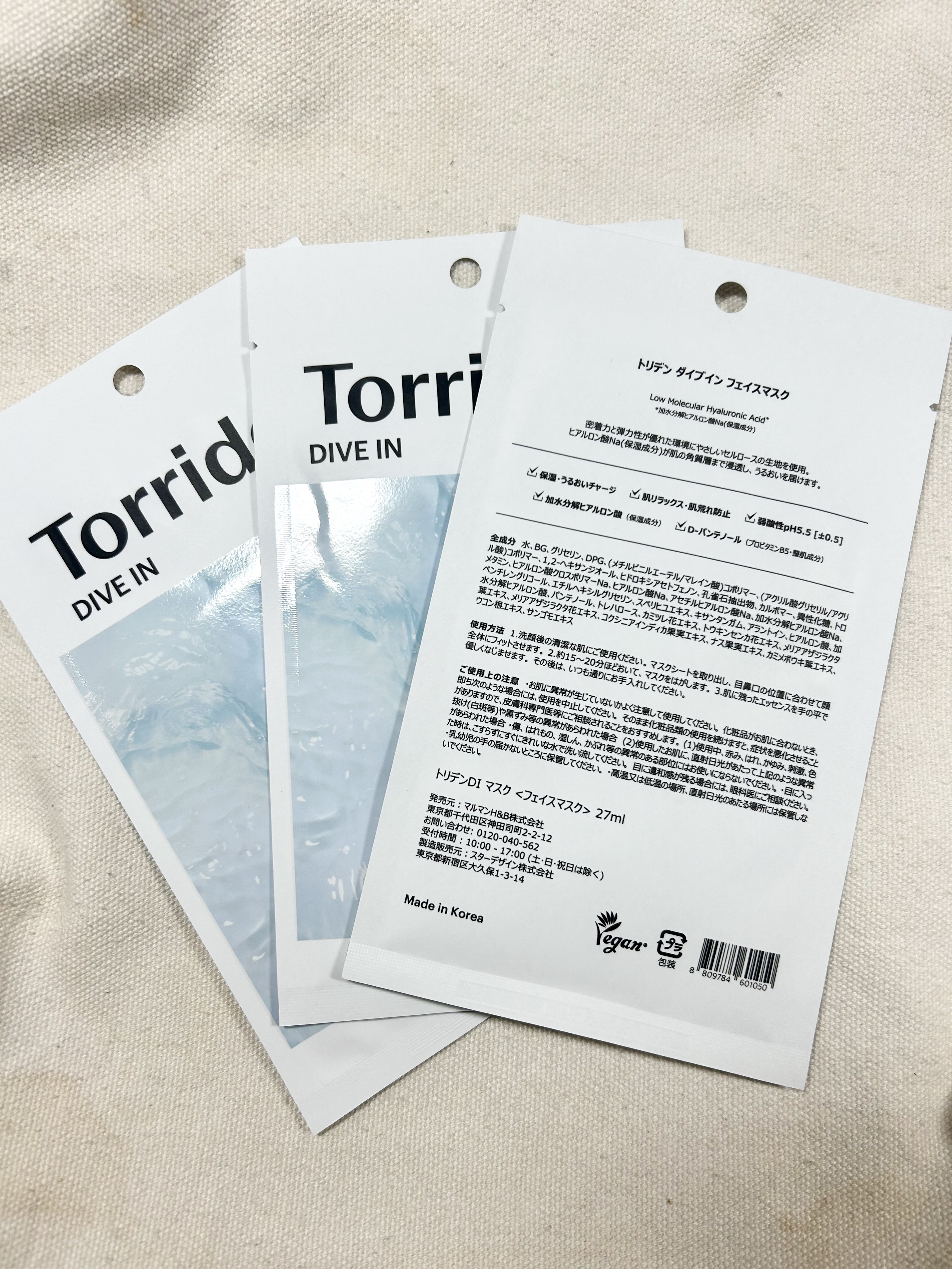 Torridenのダイブイン マスクです! なんと1パックに27mlも美容液が入ってる!!美容液約1本分ってすごすぎる😮 乾燥する今の時期はTorridenのダイブインマスクを使ってなんとか乗り切りましょう!