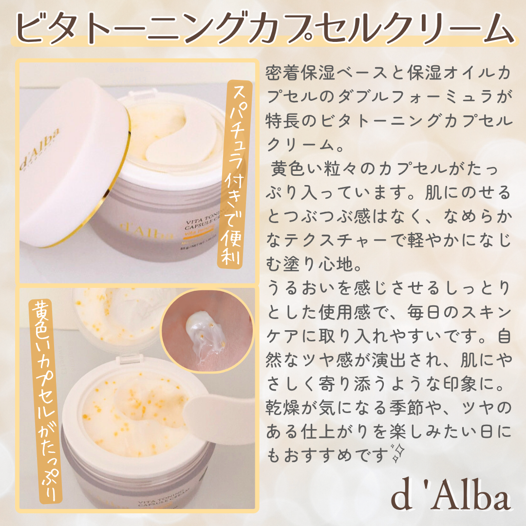 ⋆⸜ダルバさまからいただきました⸝⋆𓍯ビタトーニングカプセルクリーム⌇d'Alba肌のくすみが気になる時にぴったり!ビタミンたっぷりのカプセルクリーム💛✨☑︎シーバックソーンウォーター53%☑︎純粋ビタミンC☑︎グルタチオンリポソームオイルカ...