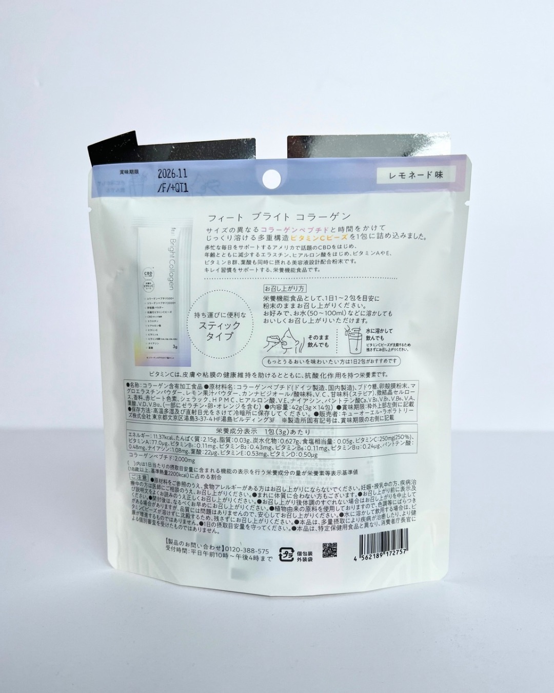 - サイズの異なるコラーゲンペプチドと、時間をかけてじっくり溶ける多重構造ビタミンCビーズを1包に詰め込んだ、キレイ習慣をサポートする栄養機能食品。多忙な毎日をサポートするアメリカで話題のCBDをはじめ、年齢とともに減少するエラスチンやヒアルロン酸、ビタミンA、ビタミンE、ビタミンB群、葉酸も同時に摂れます。 ●レモネード味●持ち運びに便利なスティックタイプ(そのまま飲んでも、水に溶かして飲んでも) 【栄養機能食品(ビタミンC)】ビタミンCは、皮膚や粘膜の健康維持を助けるとともに、抗酸化作用を持つ栄養素です。 ●本品は、多量摂取により疾病が治癒したり、より健康が増進するものではありません。●1日の摂取目安量を守ってください。●本品は、特定保健用食品と異なり、消費者庁長官による個別審査を受けたものではありません。●食生活は、主食、主菜、副菜を基本に、食事のバランスを。
