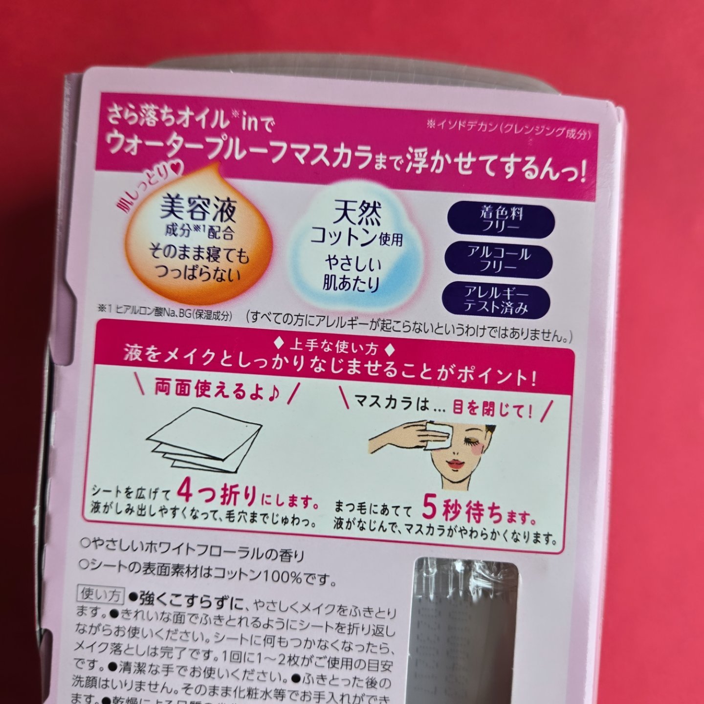 - さら落ちオイル*1inでウォータープルーフマスカラまで浮かせてするんっ!シートタイプのメイク落とし。ふいた後しっとり。 美容液成分*2配合。 ふきとった後の洗顔はいりません。そのまま化粧水等でお手入れができます。 ●やさしいホワイトフローラルの香り ●キメに入り込んだメイクも、浮かせて落とします ●天然コットン使用でやさしい肌あたり ●着色料フリー・アルコールフリー・アレルギーテスト済み (すべての方にアレルギーが起こらないというわけではありません。) *1 イソドデカン(クレンジング成分) *2 ヒアルロン酸Na、BG(保湿成分)