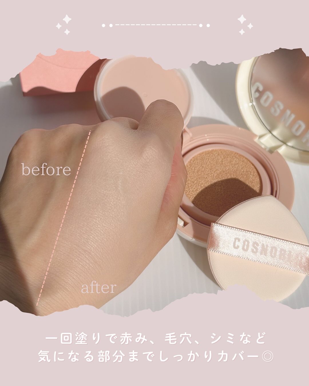 COSNORIフラフィフィットクッションファンデSPF50+PA+++軽い使用感でさらっと密着し、毛穴、赤み、シミをしっかりカバー*ふんわりフィルターをかけたようなぼかし肌に✨軽くタッピングするように塗ると綺麗に仕上がりますよ🙆♀️皮脂コン...