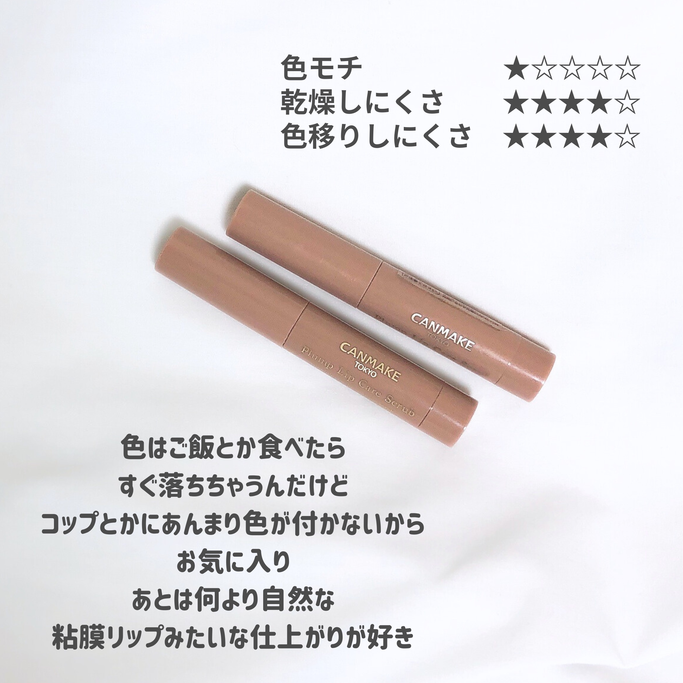 粒が大きすぎなくて塗りやすい プランプ効果も少しあるから、より縦じわにいい 03みかんイエローの方は色がほんのり付く サッと塗るのにちょうどいいコスメ 縦じわが気になる人にオススメ