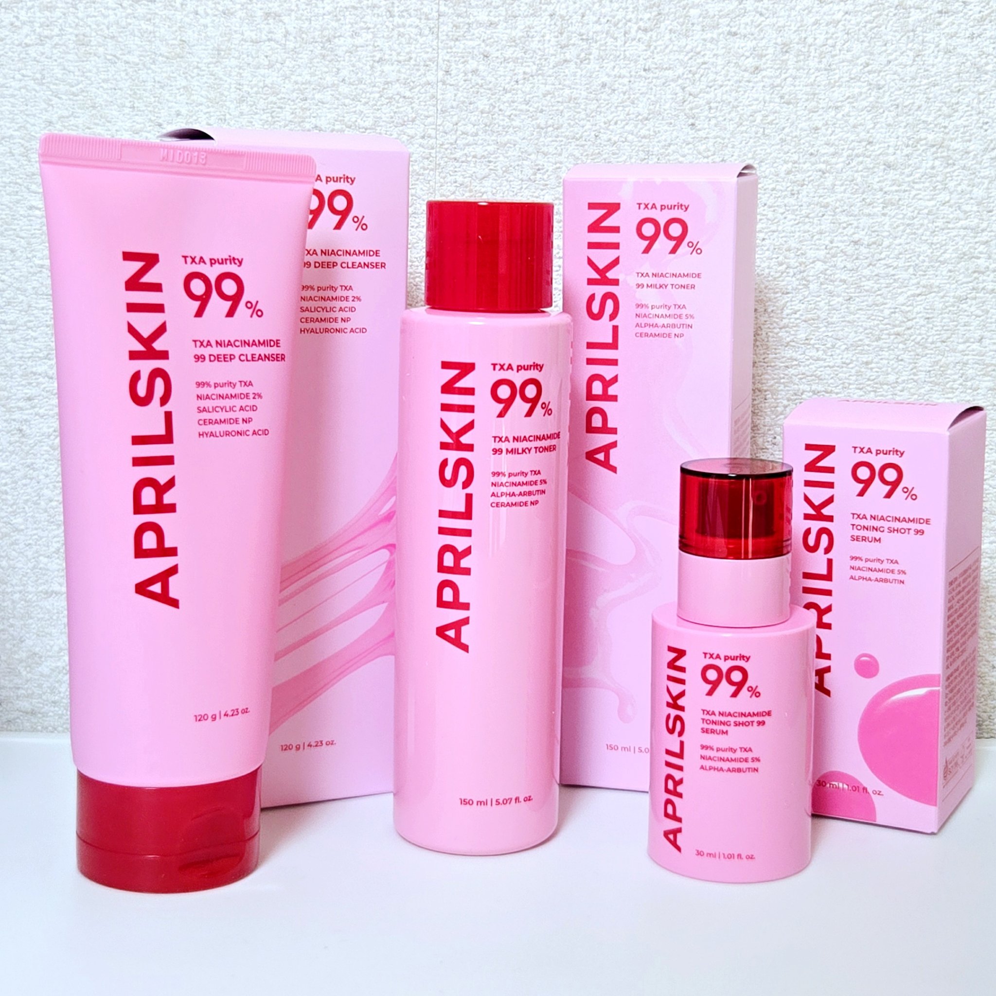 可愛いピンクのスキンケア💓▫️APRILSKIN・TXA99ディープクレンザー・TXAトーニングショット99セラム・TXA99ミルキートナートラネキサム酸とナイアシンアミドを配合したスキンケアシリーズの3アイテム。セット使いで明るくいきいきと...