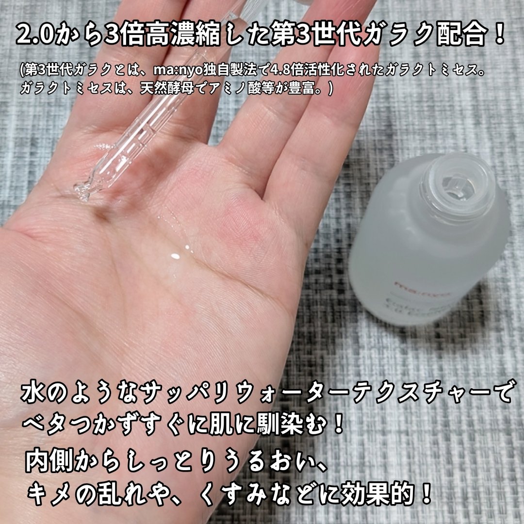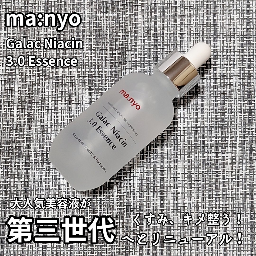 - ・manyoの独自成分!3倍*¹高濃縮でより強力な3世代ガラク 電気石を発酵器に添加し、微生物の成長に刺激を与えガラクトミセス菌の活性度増加!生長性の高いガラクトミセス菌株からガラクトミセス培養液*²を抽出し、肌のキメケアとともに透明感*³のあるお肌へ *¹ 3倍は高濃縮工程前、初期のガラクトミセス培養液(皮膚コンディショニング剤)と比較した場合 *² 皮膚コンディショニング剤 *³ キメが整った肌が与える印象のこと ・肌トーンケア*⁴、毛穴ケア*⁵、肌キメケア*⁶まで、保湿効果 3世代ガラク(Galactomy Active™ 7)と、ナイアシンアミド²配合で保湿成分をより強化し、くすんだ肌トーン*⁸から肌キメ、毛穴*⁵までケアします。 *⁴ 保湿により肌にツヤを与え明るい印象に見せること *⁵ 保湿することで肌をなめらかに整えツヤを与えることで毛穴を目立たなくすること *⁶ キメが整った素肌へ導くお手入れのこと *⁷ ガラクトミセス培養液、BG(どちらも皮膚コンディショニング剤)、1,2-ヘキサンジオール(溶剤) *⁸ 乾燥による ・水のようなさらっとしたテクスチャーで、べたつかず角質層まですっと浸透 保湿成分配合のウォータリーテクスチャーで、使用感は既存の「ガラク ナイアシン 2.0 エッセンス」と同じくさらっとした水のようなテクスチャー。角質層まで素早く浸透!べたつかない使用感で使いやすくて、角質層の奥まで潤い、表面はなめらかで整った肌へ 3月17日(月)からオフラインのバラエティショップで販売 3月24日(月)よりQoo10公式、楽天公式ショップで販売