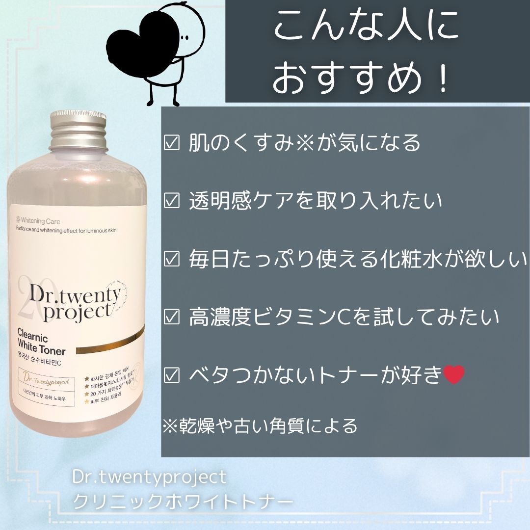 Dr.twentyproject【クリアニックホワイトトナー】純粋99%ビタミンC、ナイアシンアミド20,000ppmなどが配合。くすんだ肌を生き生きとしてくれるコスパ◎の大容量トナー😍拭き取りやコットンパックをしてもよし、顔だけじゃなく、身...