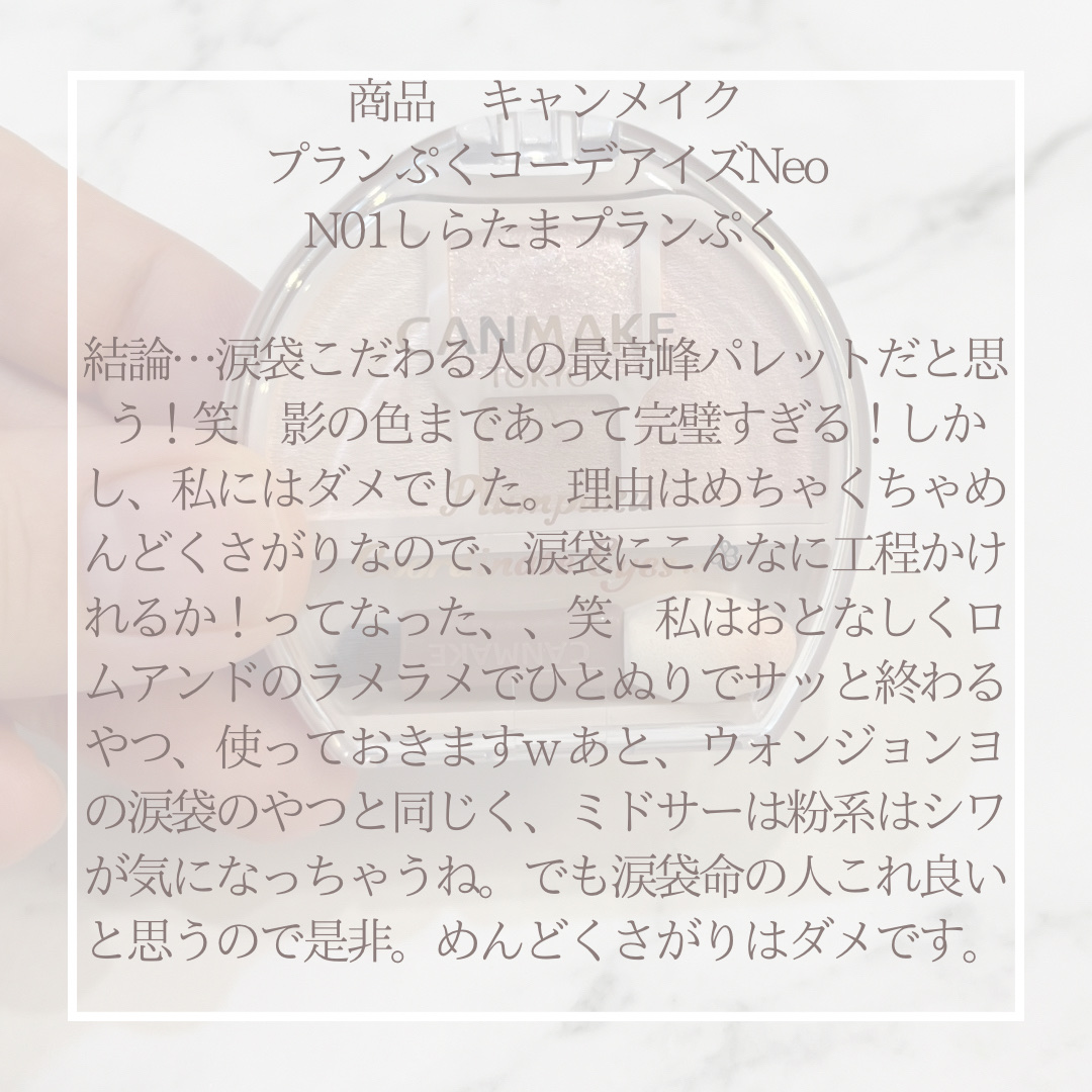 盛れすぎなくらいがちょうどいい!ぷっくり涙袋メイクの最適解!◻️CANMAKEプランぷくコーデアイズNeoN01しらたまプランぷく¥792(税込)LIPSベスコス新作賞受賞もなっとくの仕上がり!笑っても涙袋が出現しないくらいの私にはプランぷく...