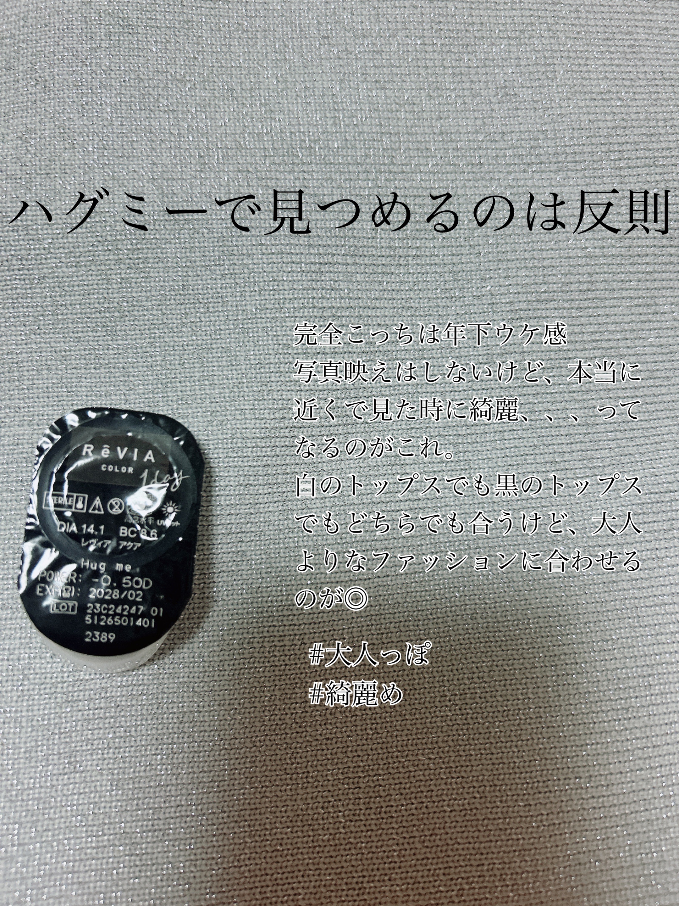 まず、このカラコンは低含水率でドライアイの人でも使用可能とかいてあり、 高含水率のカラコンしかつけたことない私は不安でしたが、そこまでの違和感はつけた瞬間からなく、1日ゴロゴロすることなくつけられました!しかも-10.00まで度数があります。 そしてこのパッケージ、、、本当に可愛すぎる。🐱 最初開封するのがもったいないくらいでした。笑笑 つけた感じは、グレーみが強い!という感じでもないです。私自身が元々茶目ぎみなのもありますが、宇宙人感やギャル感もないです。 私がつけた場合はグレージュという感じで、縁はグレー感があっても茶目感は残っていて、グレー?茶色??と、自分でも近くで見て迷うくらいの絶妙な色の瞳になります。 でも、しっかり盛れます。だし、ちょっとミステリアスな感じにも見えるので、自分的モテカラコンって感じでした! 茶色の髪の毛の人がつけると、より抜け感が出て可愛いのではないかと思いました!