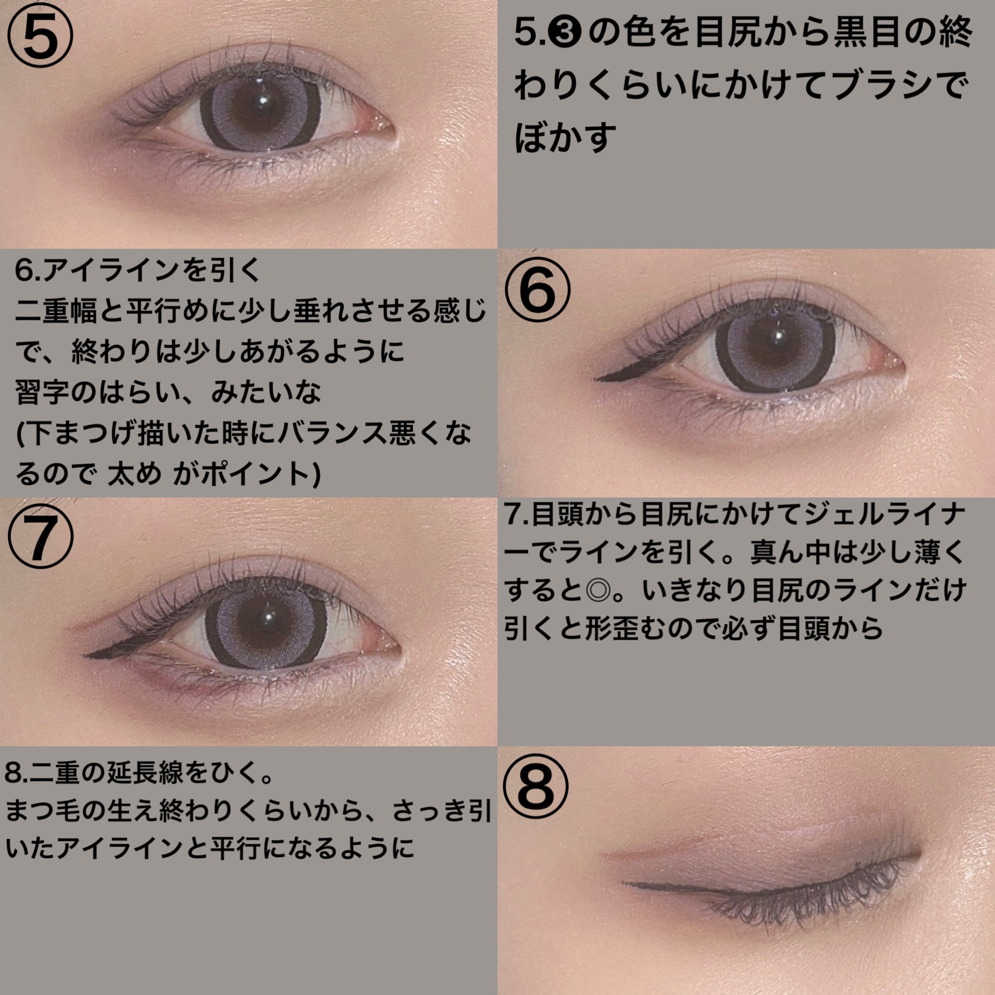 ②のオレンジを広げていきます。二重幅より広いくらい。結構多めに重ねるとかわいいです 目の際が濃くなるように上にぼかしてグラデーションにします あんまり外にはぼかしすぎず、涙袋の線は越さないようにつり目を強調していきます