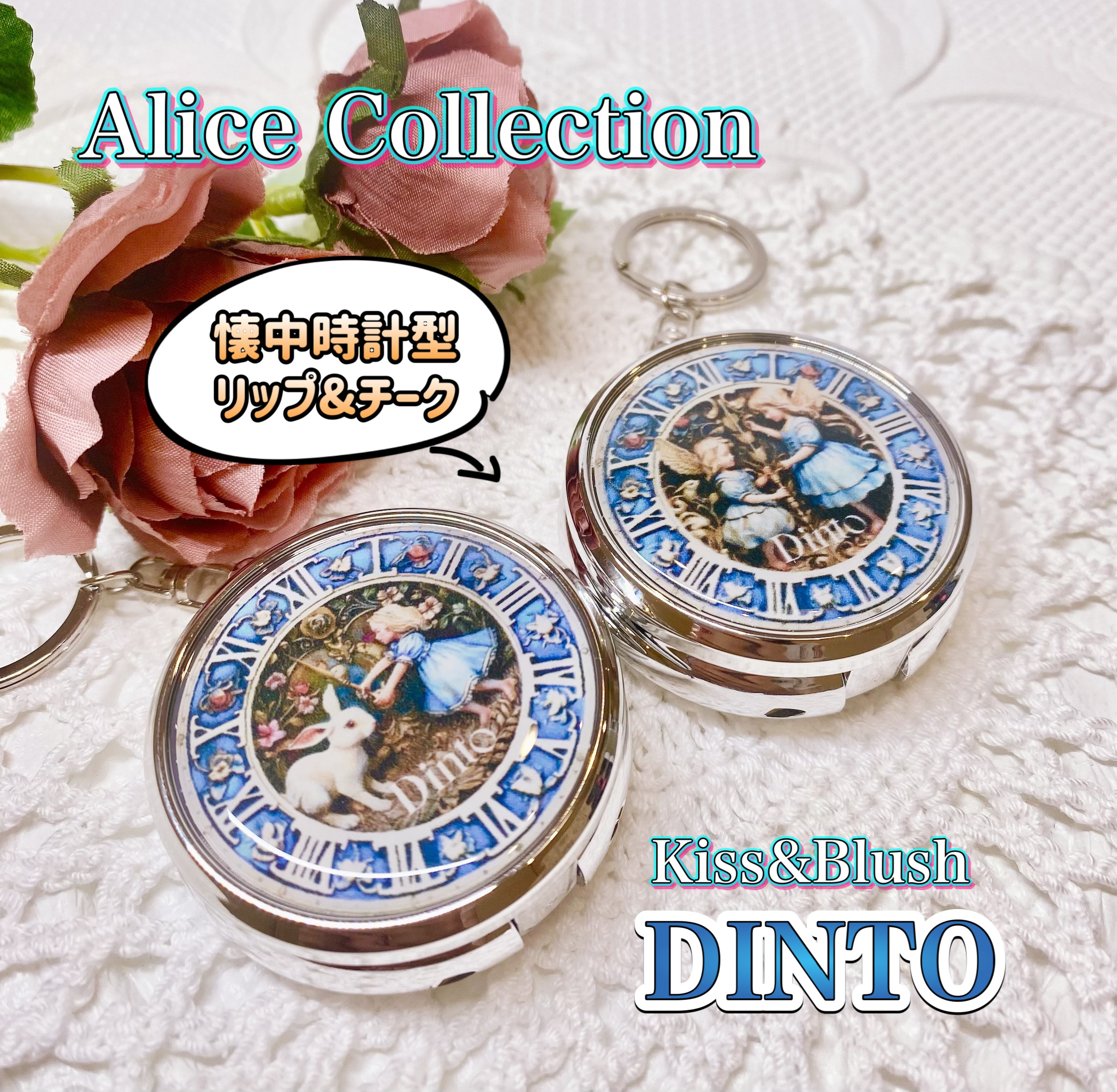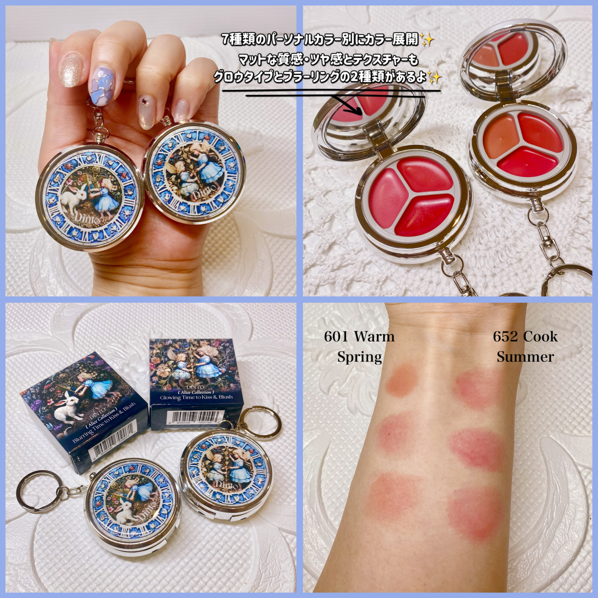ヴィーガン韓国コスメのdintoから不思議の国のアリスモチーフのリップとチークに使える懐中時計型キーリング付ポットが新発売!1個に3色入っててシーンによって使い分けできる✨ブラーリングはしっとりふんわりしたマット仕上がり💞パーソナルカラーに合...