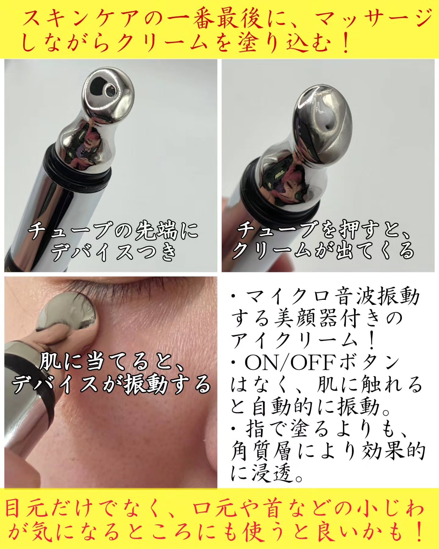 酵母+カルシウムを633,410ppmと高配合の先端が1分最大12,000回振動する振動美顔器になっているアイクリーム💁♀️ もっちりしたクリームだけどべたつかないので振動するデバイスとの相性も抜群👍 手を汚さず使えるからアイクリームが面倒くさくて続かない~というズボラ民(ワタシ)に超おすすめ💃