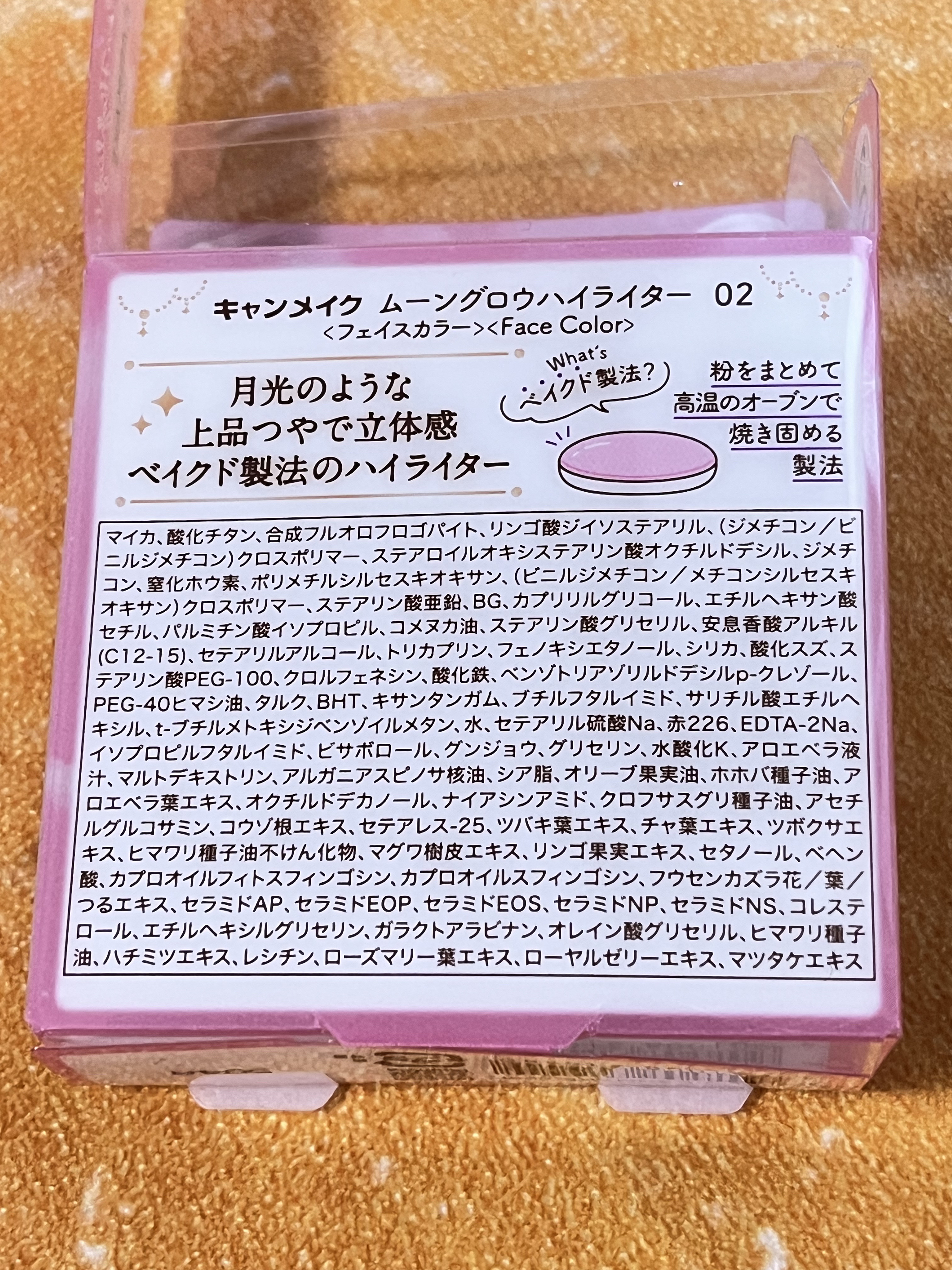 - <01 ムーングロウホワイト> マイカ、酸化チタン、合成フルオロフロゴパイト、リンゴ酸ジイソステアリル、(ジメチコン/ビニルジメチコン)クロスポリマー、ステアロイルオキシステアリン酸オクチルドデシル、ジメチコン、窒化ホウ素、ポリメチルシルセスキオキサン、(ビニルジメチコン/メチコンシルセスキオキサン)クロスポリマー、ステアリン酸亜鉛、BG、カプリリルグリコール、エチルヘキサン酸セチル、パルミチン酸イソプロピル、コメヌカ油、ステアリン酸グリセリル、安息香酸アルキル(C12-15)、セテアリルアルコール、トリカプリン、フェノキシエタノール、シリカ、酸化スズ、ステアリン酸PEG-100、クロルフェネシン、ベンゾトリアゾリルドデシルp-クレゾール、PEG-40ヒマシ油、BHT、キサンタンガム、ブチルフタルイミド、サリチル酸エチルヘキシル、t-ブチルメトキシジベンゾイルメタン、水、酸化鉄、セテアリル硫酸Na、EDTA-2Na、イソプロピルフタルイミド、ビサボロール、グリセリン、水酸化K、マルトデキストリン、アロエベラ液汁、アロエベラ葉エキス、アルガニアスピノサ核油、シア脂、オリーブ果実油、ホホバ種子油、オクチルドデカノール、ナイアシンアミド、クロフサスグリ種子油、アセチルグルコサミン、コウゾ根エキス、セテアレス-25、ツバキ葉エキス、チャ葉エキス、ツボクサエキス、ヒマワリ種子油不けん化物、マグワ樹皮エキス、リンゴ果実エキス、セタノール、ベヘン酸、カプロオイルフィトスフィンゴシン、カプロオイルスフィンゴシン、フウセンカズラ花/葉/つるエキス、セラミドAP、セラミドEOP、セラミドEOS、セラミドNP、セラミドNS、コレステロール、エチルヘキシルグリセリン、ガラクトアラビナン、オレイン酸グリセリル、ヒマワリ種子油、ハチミツエキス、レシチン、ローズマリー葉エキス、ローヤルゼリーエキス、マツタケエキス