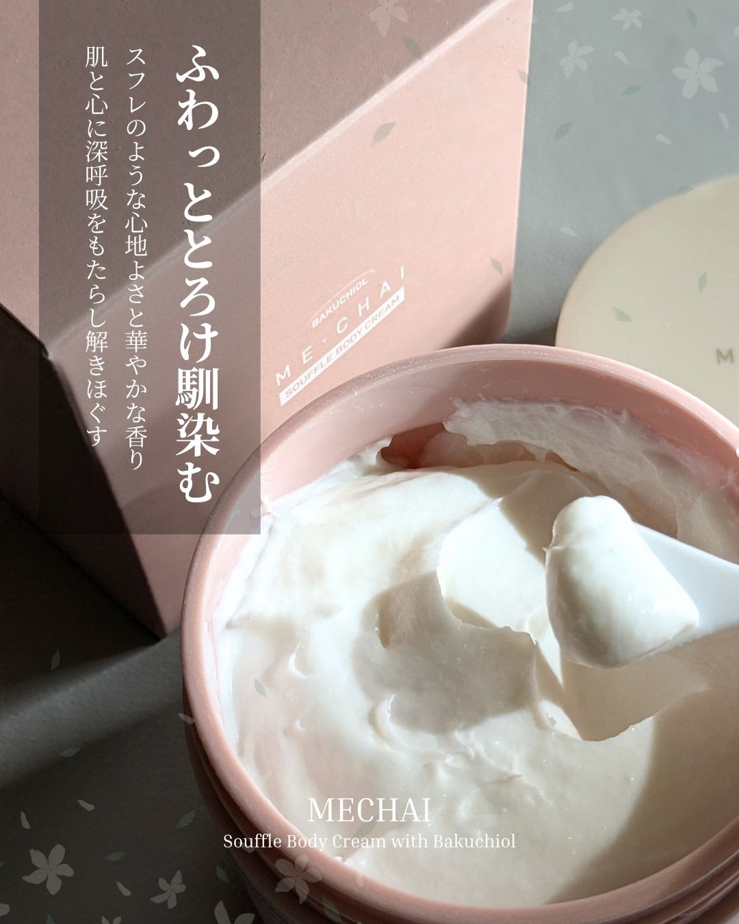ふわもち♡MECHAIバクチオールスフレボディクリームGiftedbyMECHAI✨人気YouTuberの会社員Jちゃんが立ち上げたブランドで期待大😻💞肌を保湿と弾力で満たしてくれるスフレのようなふわふわフレグランスボディクリーム✨真夏の紫外...