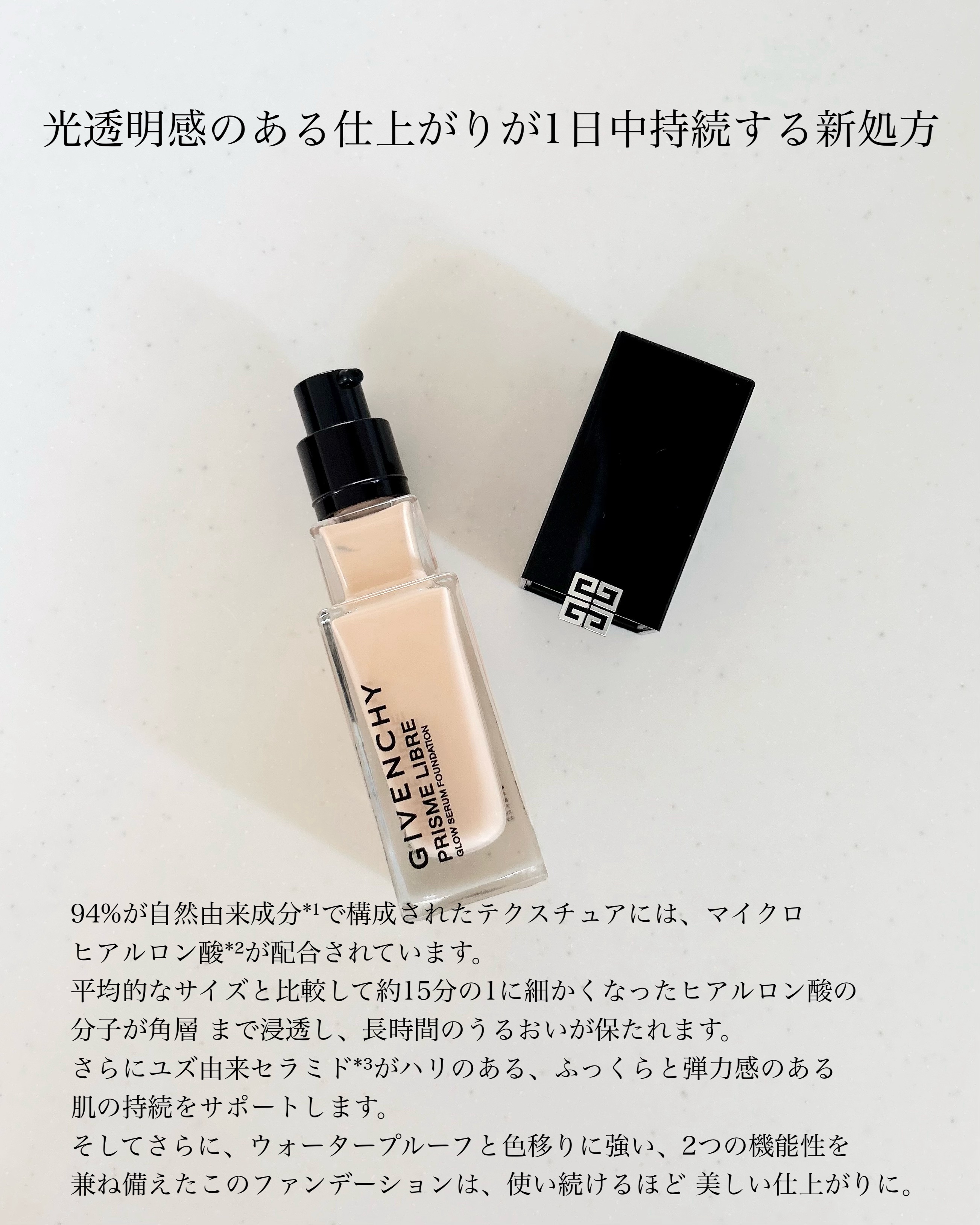 - 光透明感を叶える美容液ファンデーション ジバンシイを代表する製品である「プリズム・リーブル」に着想を得たプリズム・ブレンド処方が、気になる肌悩みを1日中ぼかしながら、 みずみずしいうるおいと透明感に包まれた自然なセミツヤ肌を演出。 角層まで届くマイクロヒアルロン酸*1とユズ由来セラミド*2によって長時間うるおいとツヤあふれる“ロングラスティング・スキンケアリング効果”を実現。 いつでも「プリズム」のような光透明感のある肌を叶える、新世代美容液ファンデーションです。 *1:ヒアルロン酸(保湿成分)*2:ユズ果実エキス(保湿成分)
