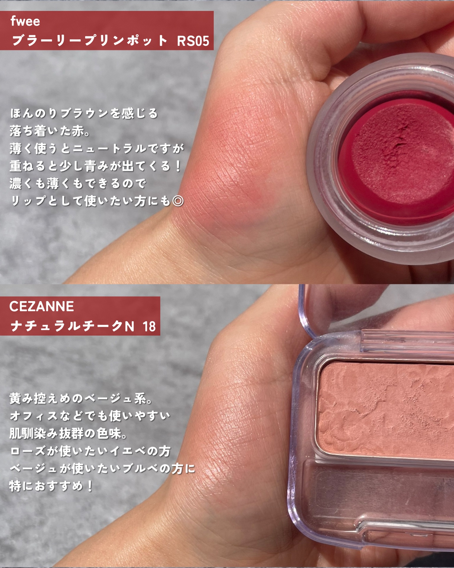 粉質がすごく良くなって、しっとり感とツヤ感が強くなりました! 04が個人的大ヒットで🥹💯 他のチークと混ぜて使うと、ツヤっぽくほわーっとした色付きになって最高! チーク要らない派の方に是非試してみて欲しいカラーです🫶🏻