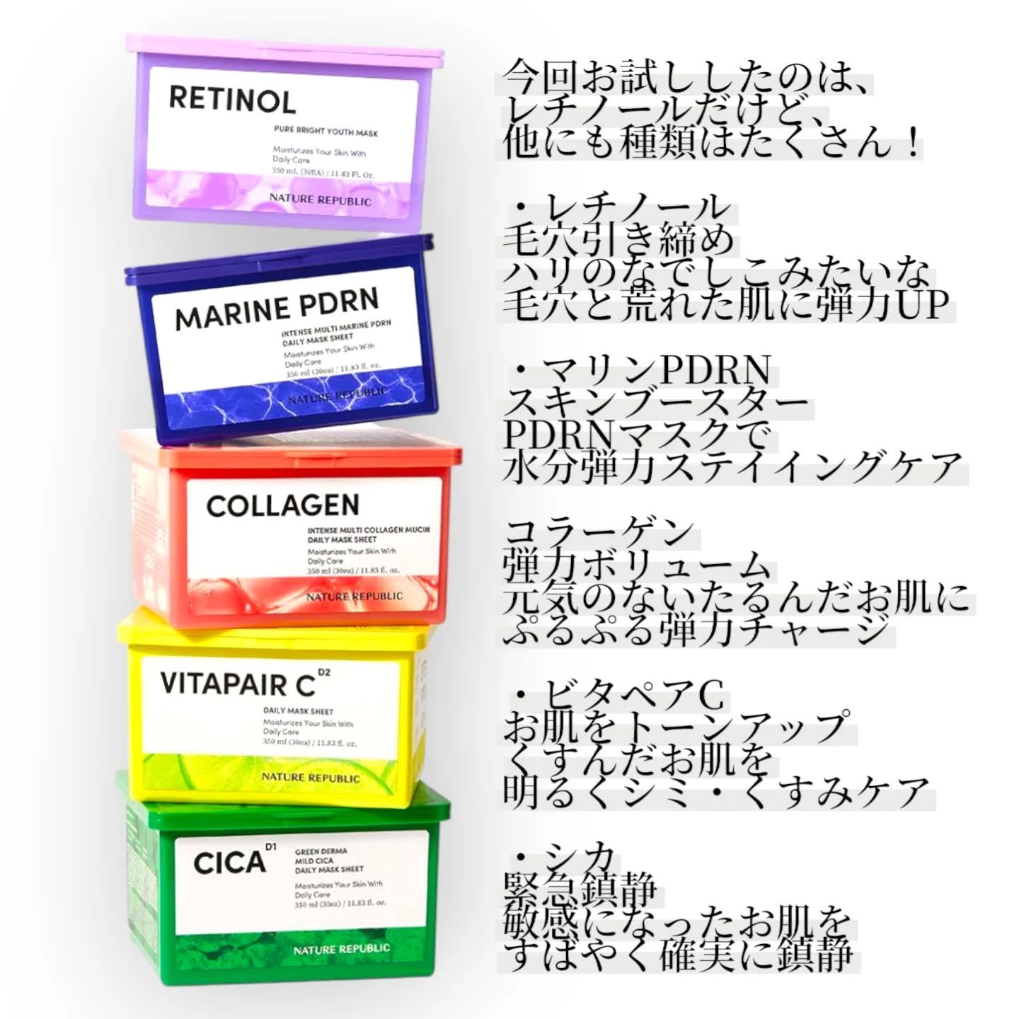 .#PR★ネイチャーリパブリック レチノールデイリーシートマスク化粧水代わりに毎日使えるデイリーシートマスク✨3分間貼るだけなので気軽に使えるのがいい。リニューアルして21→30枚入りになったのも嬉しい🥳しっとりべたつかない使用感で、薄くてピ...