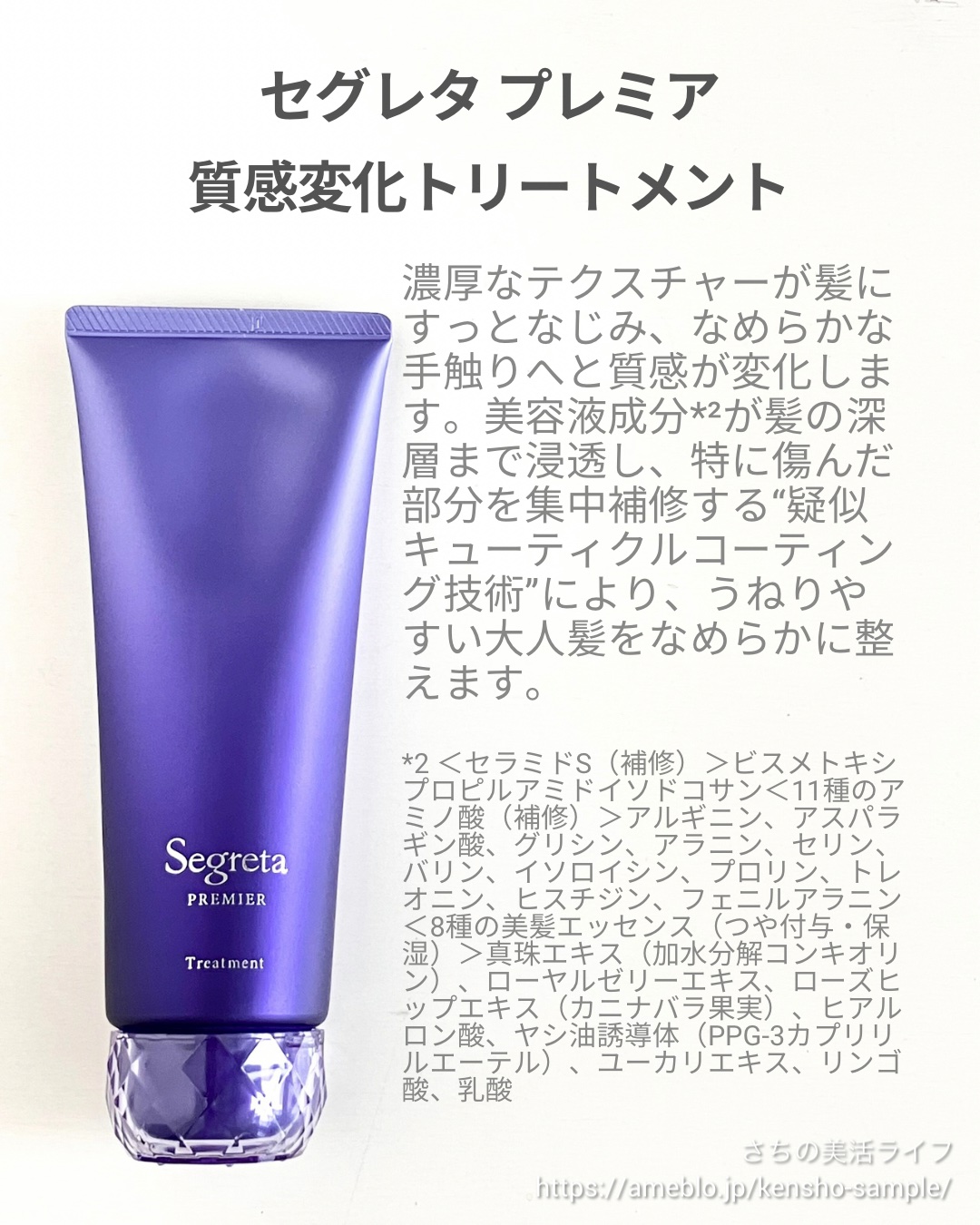セグレタさまからいただきました。花王の研究技術から生まれた大人髪のためのプレミアムライン▶セグレタプレミア凝縮美容液シャンプー泡立てる前に地肌や髪の根元になじませる、『美容液ラッピング洗い』で髪1本1本に美容液成分*を惜しみなく届けます。トリ...