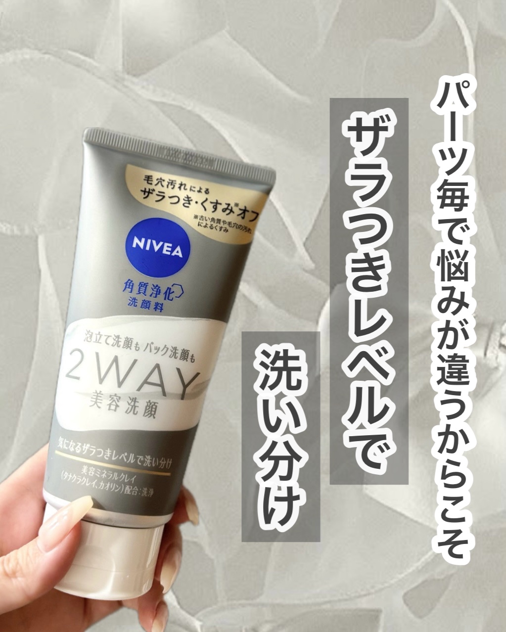 - ※商品名変更(旧名:ニベア クリアビューティー2WAY美容洗顔)に伴い、商品パッケージを順次リニューアル。尚、これにかかる商品の返品・交換は承っておりません。 気になるザラつきレベルに合わせて洗い分け。 毎日の汚れには泡でしっかり。 ザラつき気になる日はパックでごっそり。 古い角質を柔らかくほぐし、汚れを吸着する洗顔料。 毛穴汚れによるザラつき、くすみ*までさっぱり落とします。 透明感のある、毛穴の目立ちにくいつるんとなめらか肌へ。 ●美容ミネラルクレイ配合:タナクラクレイ、カオリン(洗浄) ●リッチホワイトパール保湿成分配合:ホホバオイル、加水分解コンキオリン *古い角質や毛穴の汚れによるくすみ